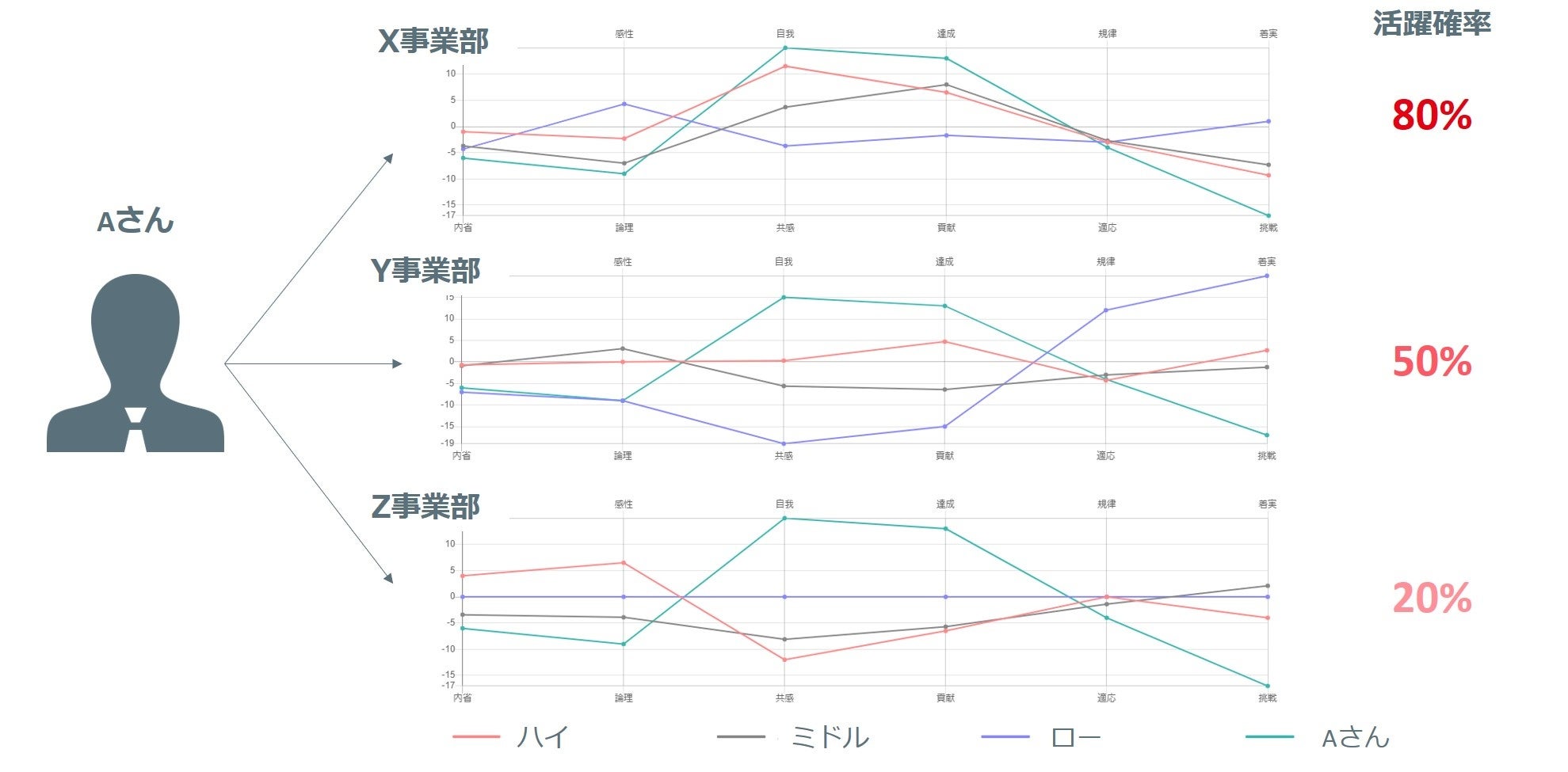 ・各従業員に対し、配置・異動先それぞれの活躍確率が一覧で表示でき、配属先候補ごとの活躍確率を定量化することができます。
