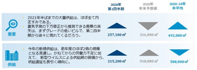 東京オフィス市場は、2020年後半から景気後退の余波が続くが、2021年内には段階的な市場回復を予想している。 金融危機 同様の需要消滅を仮定しても、吸収需要(ネット・アブソープション)がマイナスに落ち込むことまでは見込まれない。過去の教訓から、貸主は危機対応への備えができており、今後の供給についても、2020年は92%以上、2021年は52%以上の高い内定率が維持されている。