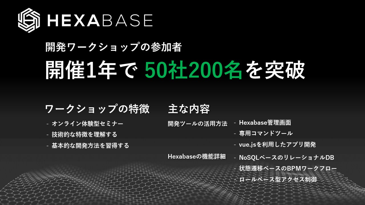 企業向けクラウドサービスを提供する株式会社Hexabase(呼称:ヘキサベース、代表取締役CEO:岩崎英俊、所在地:東京都千代田区、以下ヘキサベース)は、日本発のバックエンドクラウドサービス「Hexabase」についてシステムエンジニア向けワークショップの参加者が開催1年で延べ50社200名を突破したことを発表します。