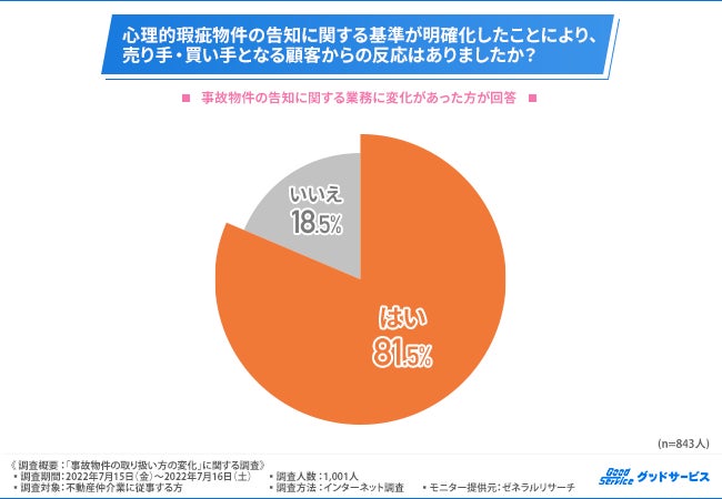 「心理的瑕疵の告知に関する基準が明確化したことにより、売り手・買い手となる顧客からの反応はありましたか?」と質問したところ、『はい(81.5%)』『いいえ(18.5%)』との回答結果になりました。