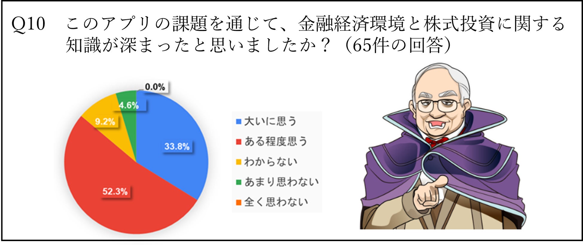 「このアプリの課題を通じて、金融経済環境と株式投資に関する知識が深まったと思いましたか?」との問いに、アンケートに答えた学生の86.1%から「大いに思う」または「ある程度思う」との回答をいただきました。