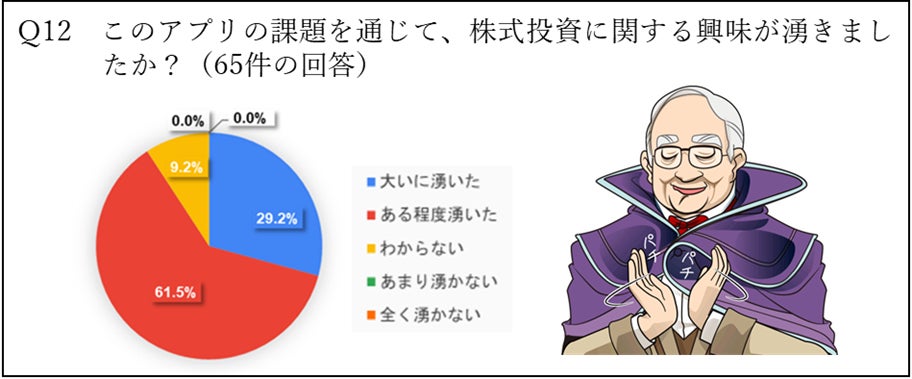 また、「このアプリの課題を通じて、株式投資に関する興味が湧きましたか?」との問いには、「大いに湧いた」と「ある程度湧いた」を合わせると90.7%に達しました。