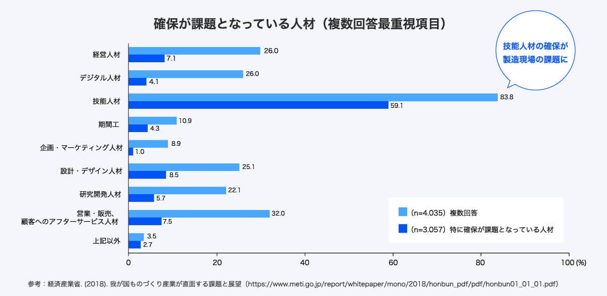 ものづくり白書の調査でも公表されているように製造業における「技能人材」の確保は大きな課題となっています。一言に「製造業」と言っても、自動車業界など同一業界内でも生産工程は多岐に渡り、さらにその生産工程内まで目を向けるとそこで利用される設備のメーカー、種類もさまざまです。生産現場で活躍する技能者に加え、設計・開発といった職種についてもこうした業界、取り組む課題の違いは存在し、発生する業務の種類はバラエティに富んでいます。こうした中、自社で利用する設備等の環境にマッチする人材の確保は難しく、とりわけ中堅・中小企業においてはその採用ハードルが高くなっています。