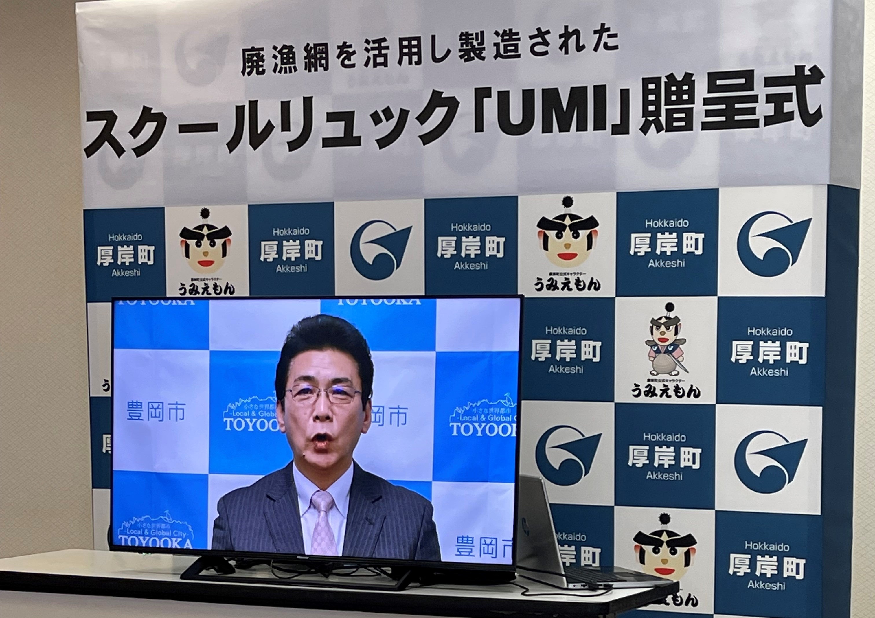 そのような想いで2020年から商品開発を進めてきました。町役場で行われた寄贈式では、豊岡鞄の産地である兵庫県豊岡市の関貫久二郎市長からのビデオメッセージも上映された。また、厚岸町の石塚副町長は「来年は厚岸町で”全国豊かな海づくり大会”の開催も控えており、漁業や海洋環境について考える機会にしたいと」話されていた。