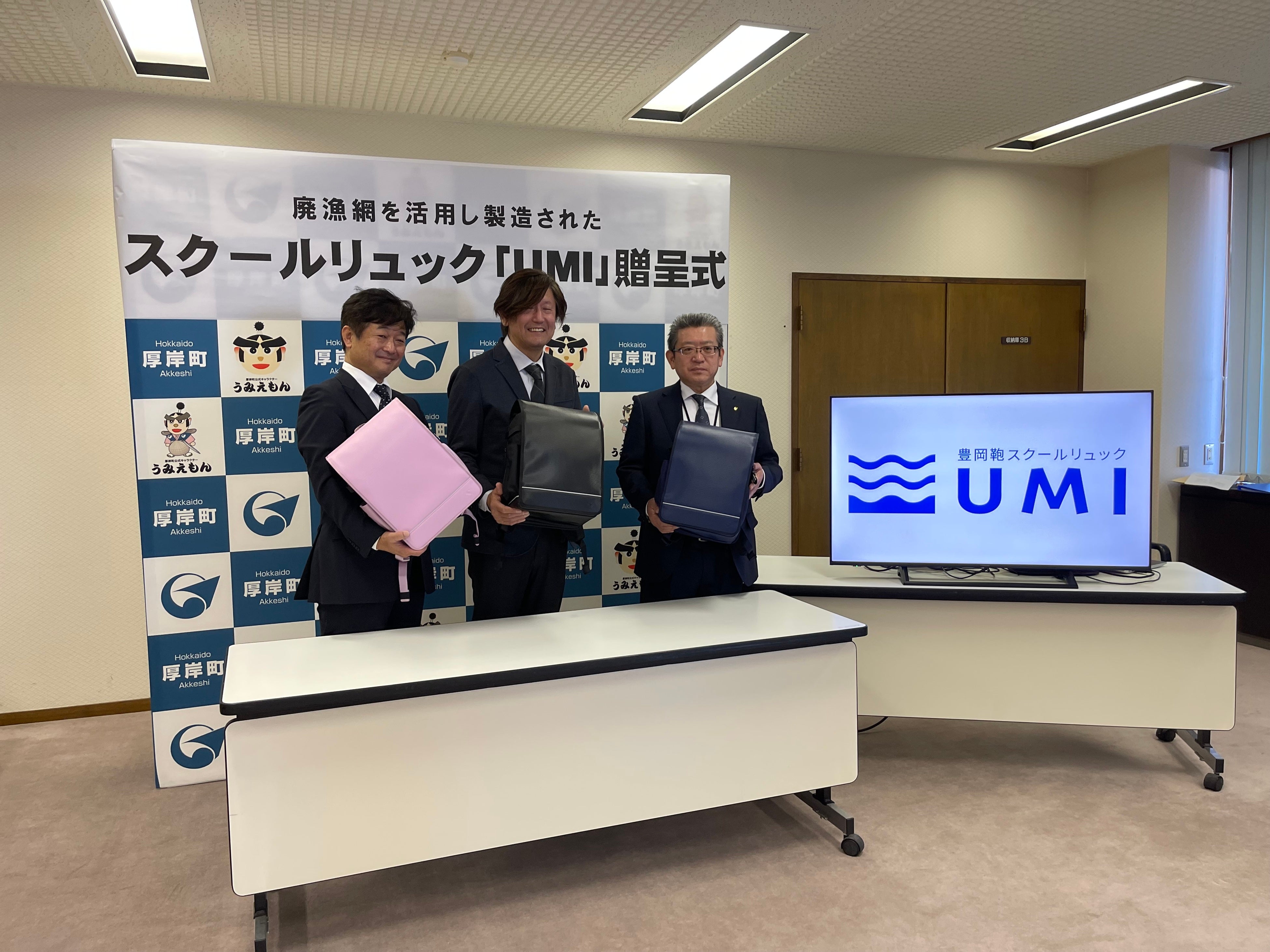 【機能をカタチに創造する】をコンセプトに掲げる株式会社アートフィアー(兵庫県豊岡市中央町8-4 代表取締役 土生田昇 TEL:0796-23-5408)は、「安全・安心・大容量で使いやすく長く使える」漁網再生ナイロン生地を主材とした環境配慮型の豊岡鞄スクールリュック「UMI(ウミ)」を、廃棄漁網の回収拠点でもある北海道厚岸町の新1年生に寄贈する運びとなり、その贈呈式が12月16日に厚岸町で行われました。
