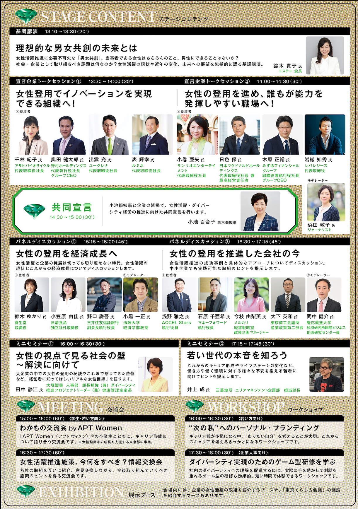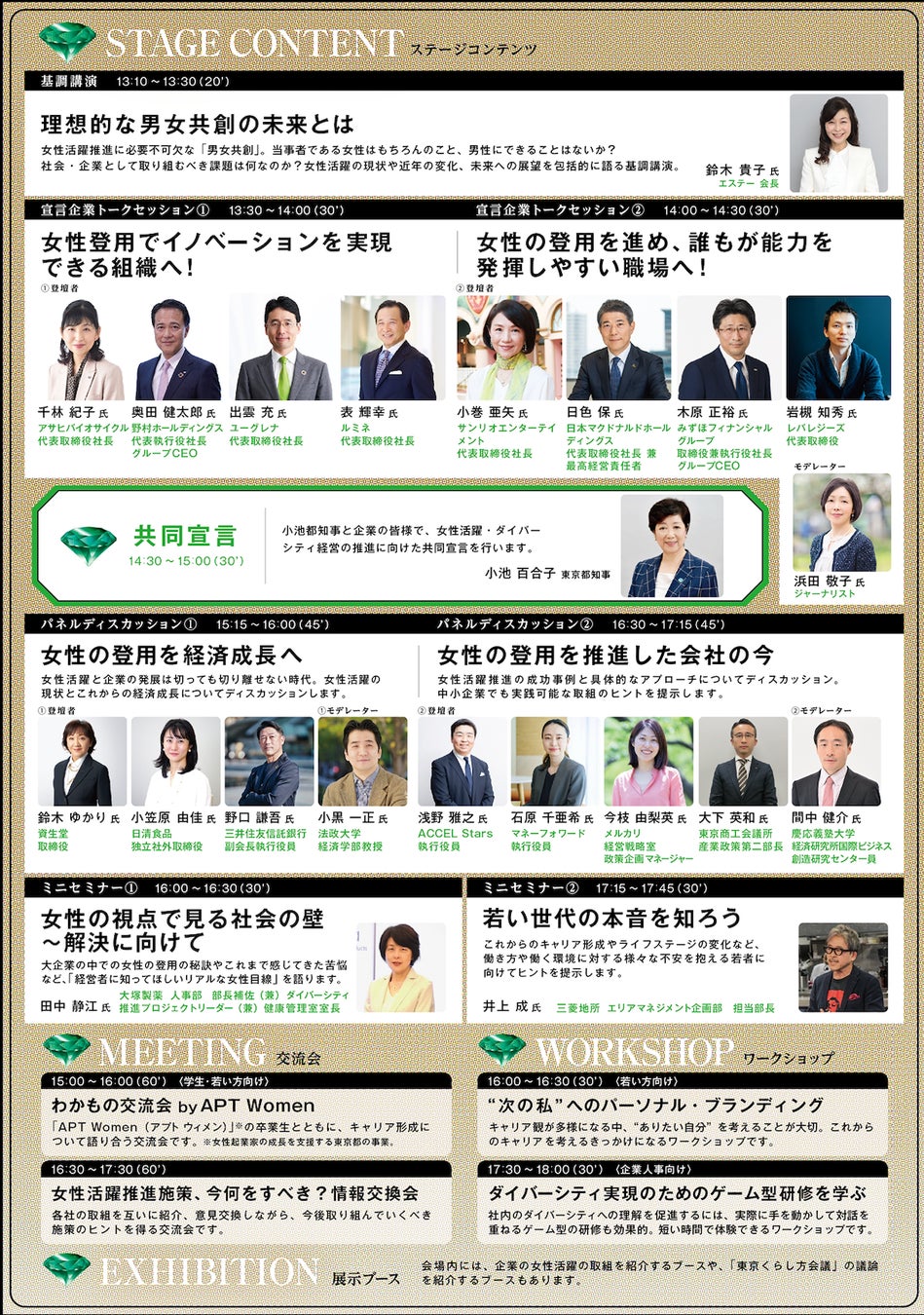 東京都では、経営者の意識や職場の文化の変革を促す社会的なムーブメントを醸成するため 「東京女性 未来フォーラム」を開催します。今回は女性の登用を主なテーマとし、企業の トップと女性活躍・ダイバーシティ経営の推進に向けた共同宣言を行うとともに、女性登用 の必要性や企業における具体的な事例を発信し、社会全体に取組を波及させていきます。