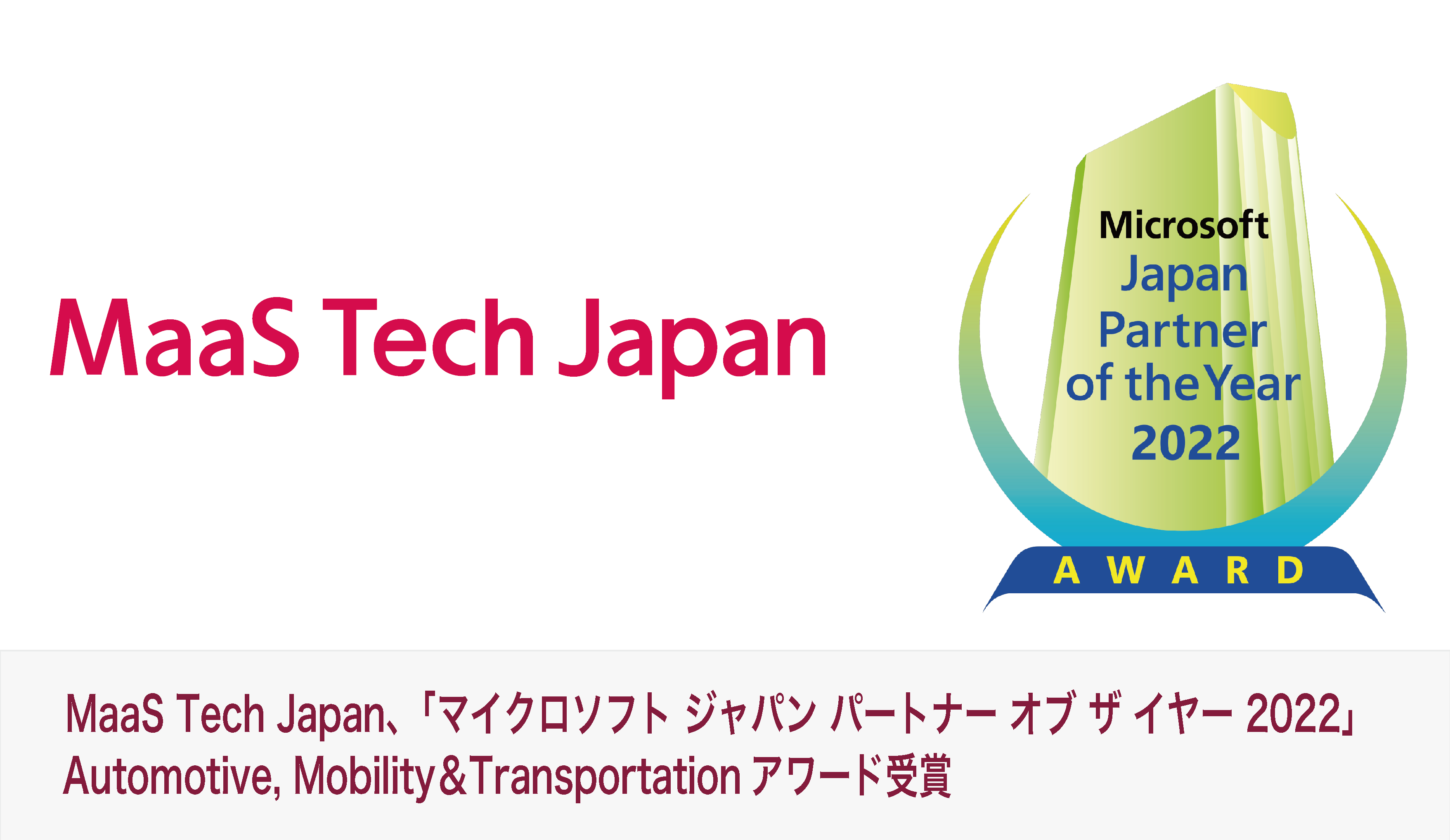 未来の理想的な移動社会の基盤構築を支援する株式会社MaaS Tech Japan (本社:東京都千代田区、代表取締役:日高 洋祐、以下「MaaS Tech Japan」、https://www.maas.co.jp/) は、この度、日本マイクロソフト株式会社(以下、日本マイクロソフト)の「マイクロソフト ジャパン パートナー オブ ザ イヤー 2022」において、「Automotive, Mobility & Transportation アワード」を受賞しました。