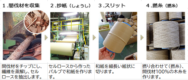 スギやヒノキと聞くと花粉のアレルギーを心配される方もいらっしゃると思いますが、以下の工程のとおり間伐材をチップにし、更に和紙にしてから糸にしているので、花粉は含まれていません。
