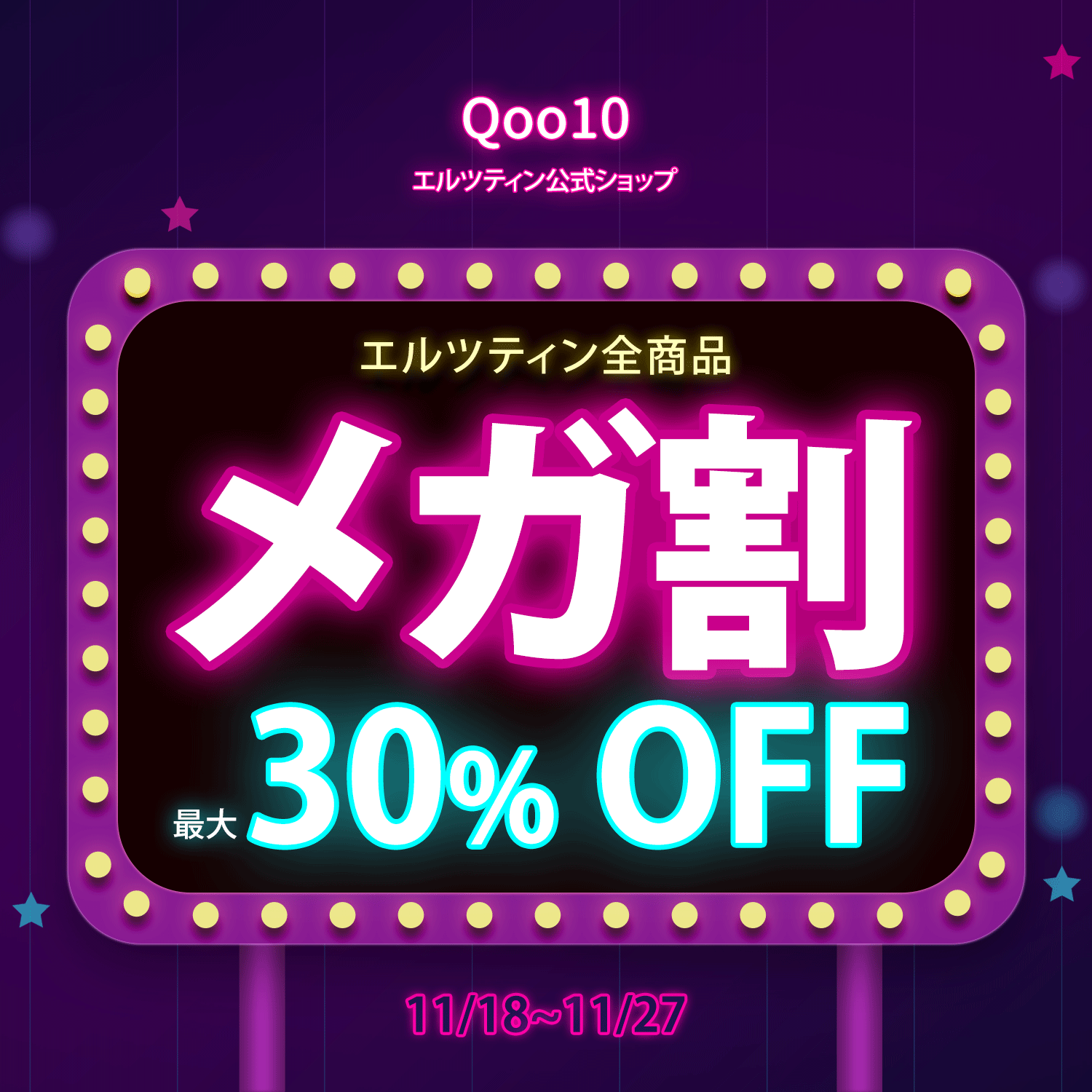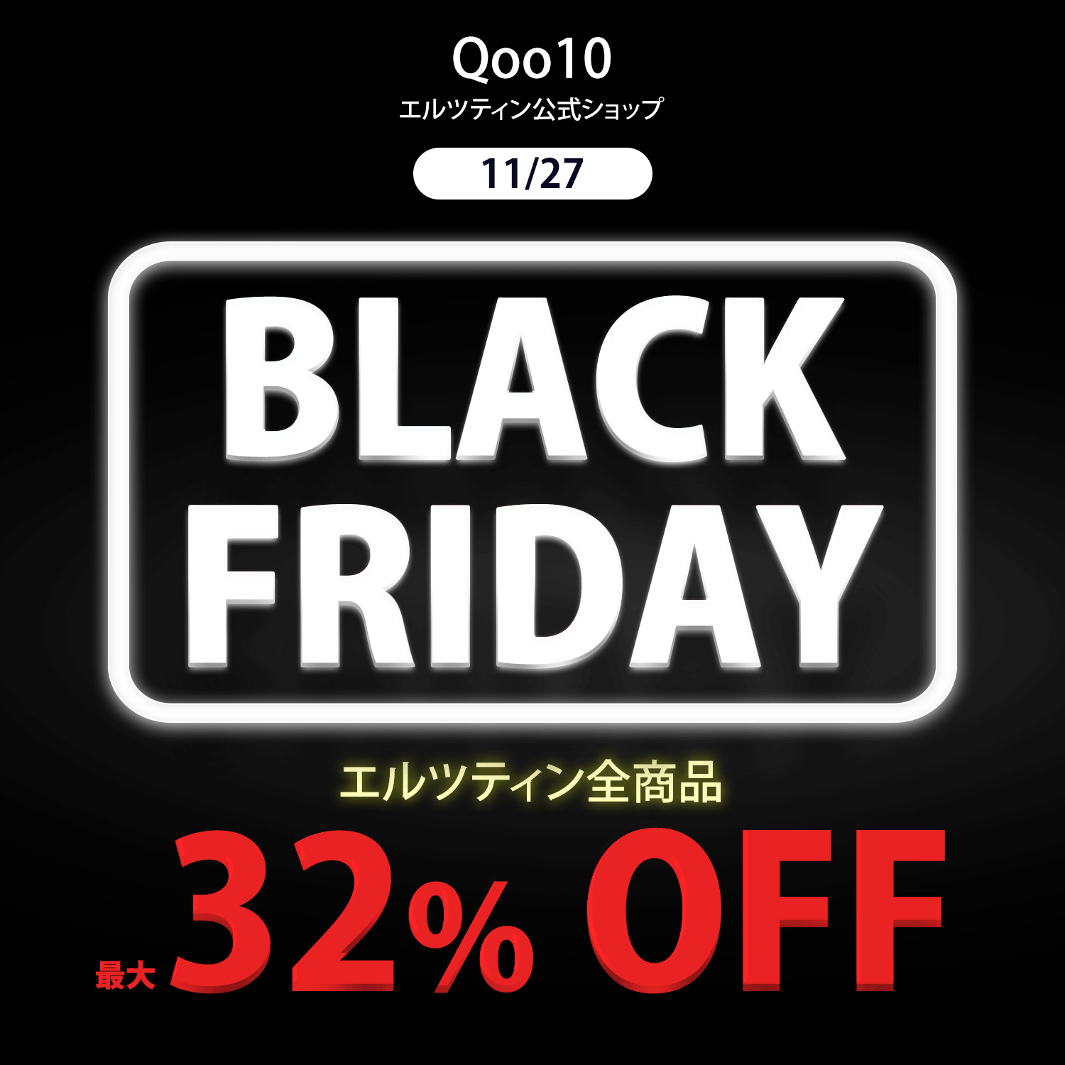 年に4回のメガ割に加え、ブラックフライデーセールで全商品を最大32%OFFでお買い求めいただけます。ぜひ、この機会Qoo10にてエルツティン商品をお楽しみください。