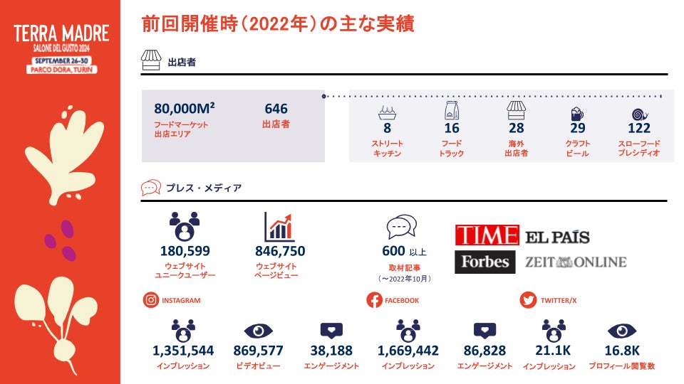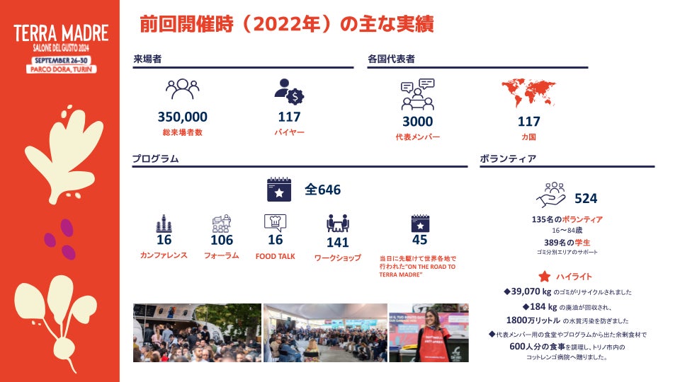 - 前回開催時のハイライト写真: https://media.slowfood.it/Terra-Madre-Salone-del-Gusto-2022