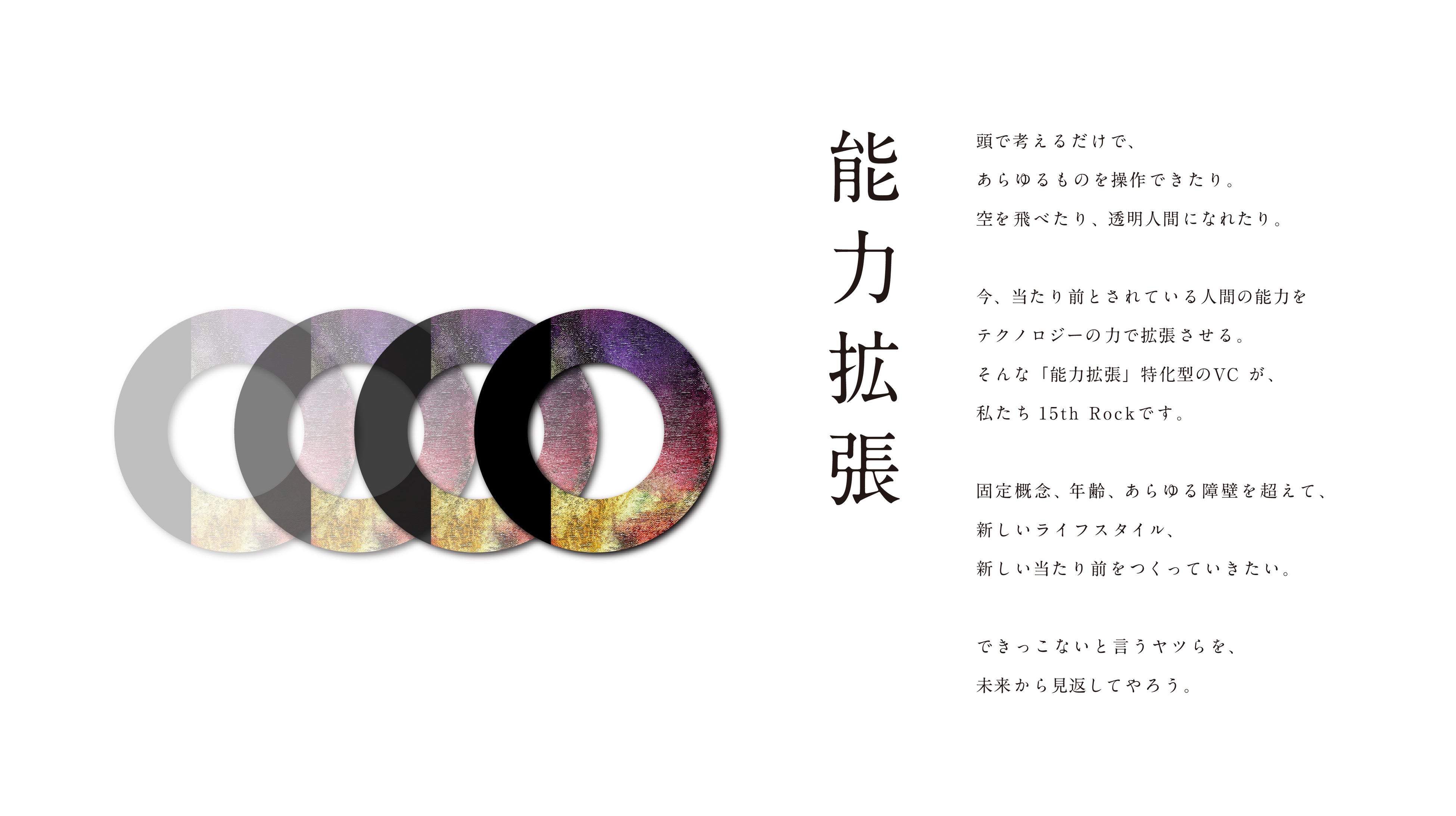 15th Rockは投資領域をHuman AugmentationとConsumer Serviceに定め、投資活動を行っているベンチャーキャピタルです。Human Augmentationとは、ひとの身体能力を向上させることで、これまで不可能であった様々なスキル習得を可能にする技術です。弊社はHuman Augmentationへの投資を通じて、人生における選択肢を増やし、人生100年時代の豊かな社会を実現することを目指します。