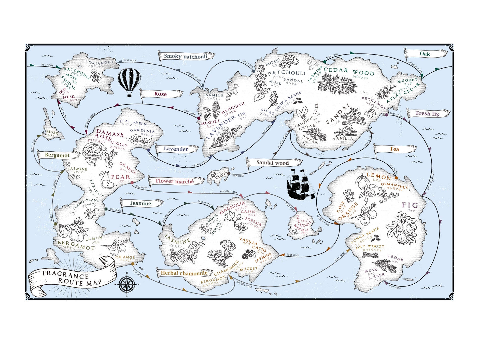 全11種類の香り名を航路とし、個性的で心が動かされる香りの変化を表現しています。そして、その架空の香りの世界を描いた航海図をパッケージとしおりにデザインしました。香りで癒される心の旅へと誘います。