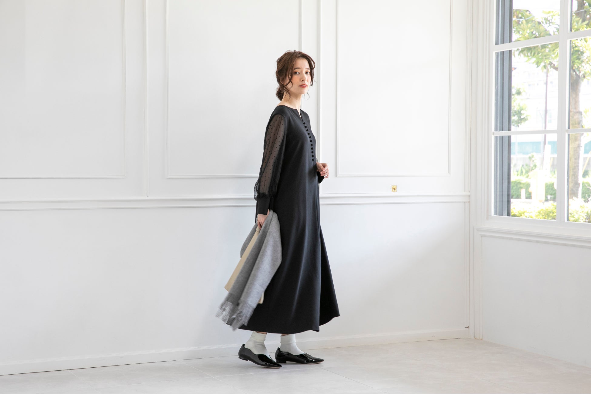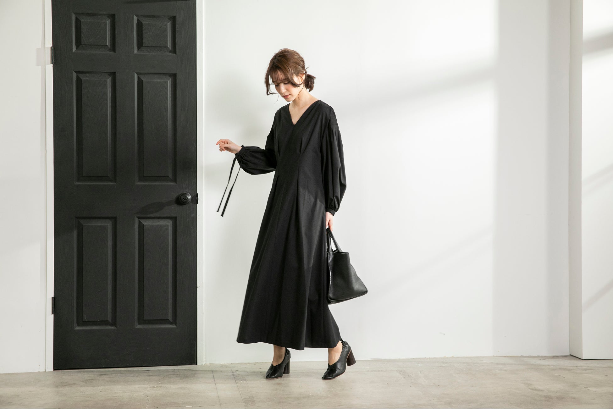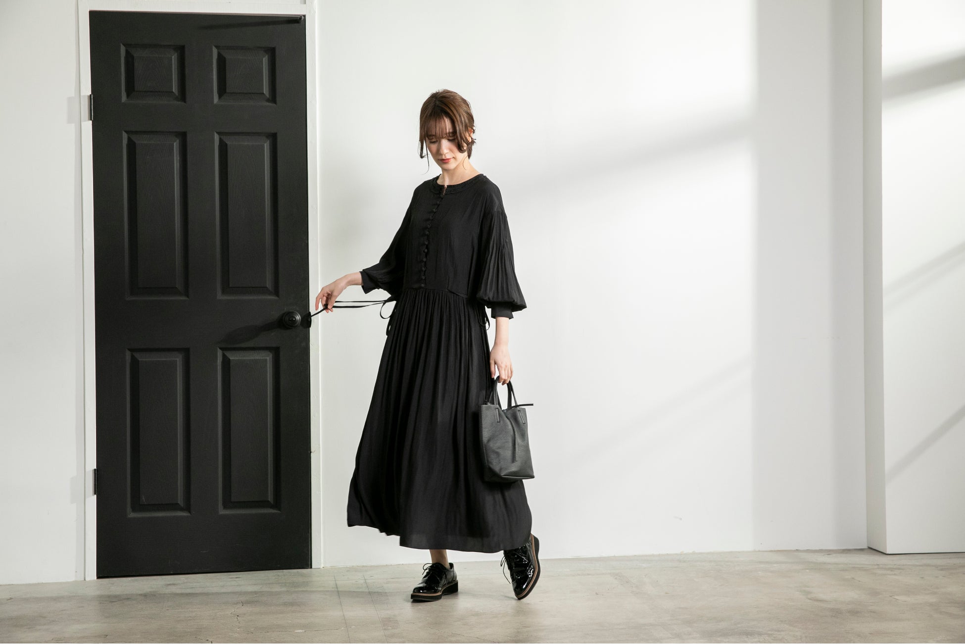 バルーンスリーブと長めの丈を組み合わせ、甘さとクールさの好バランスを実現したブラックドレス。価格:¥47,300