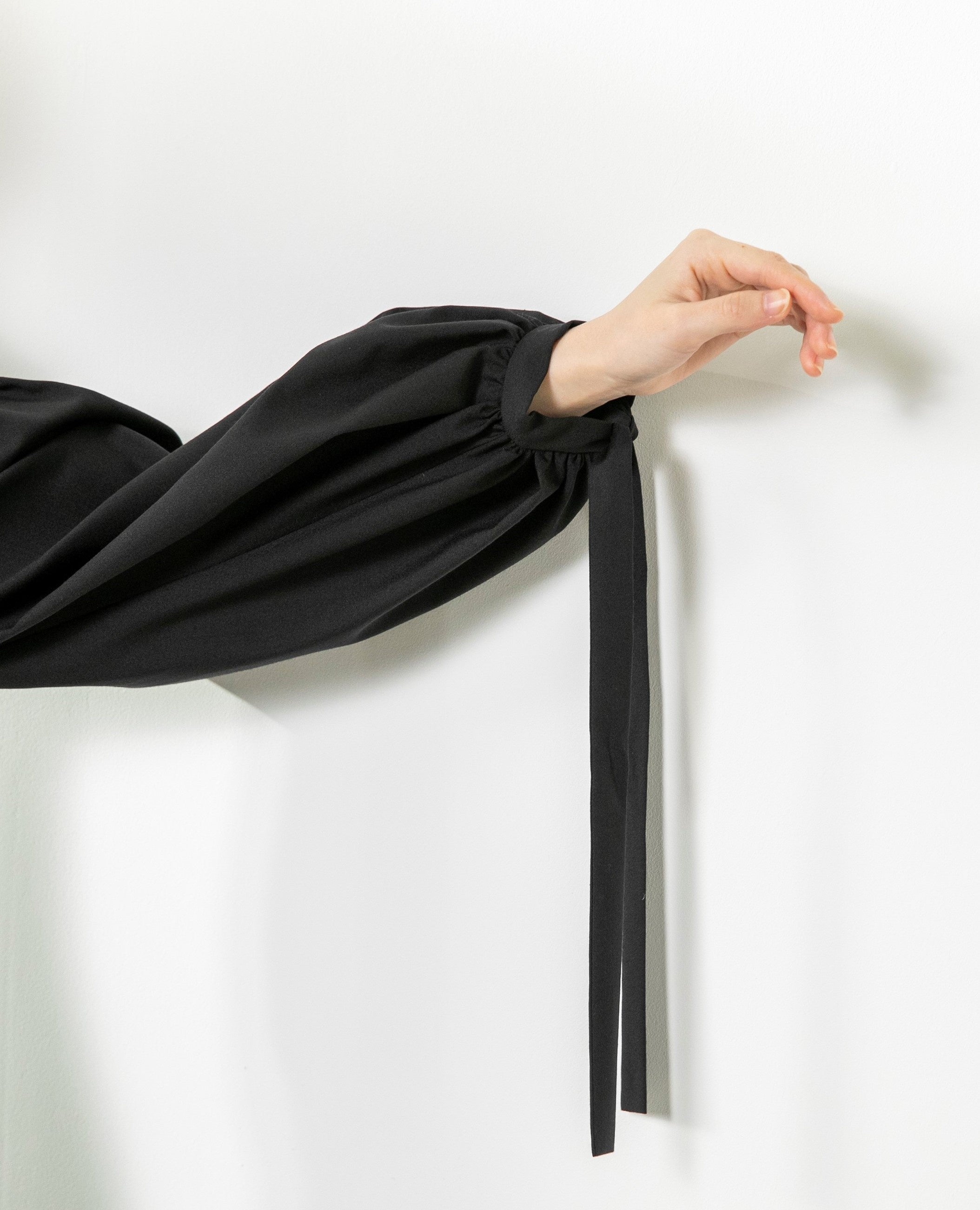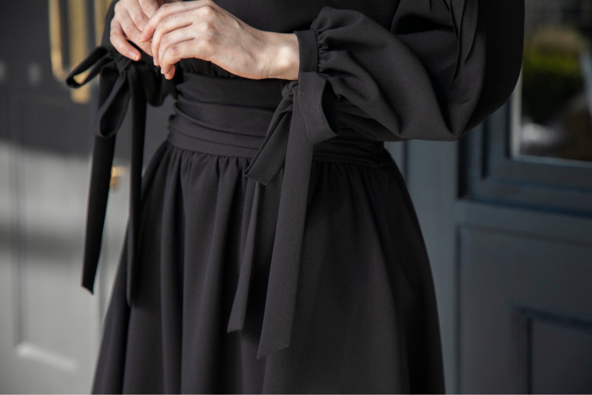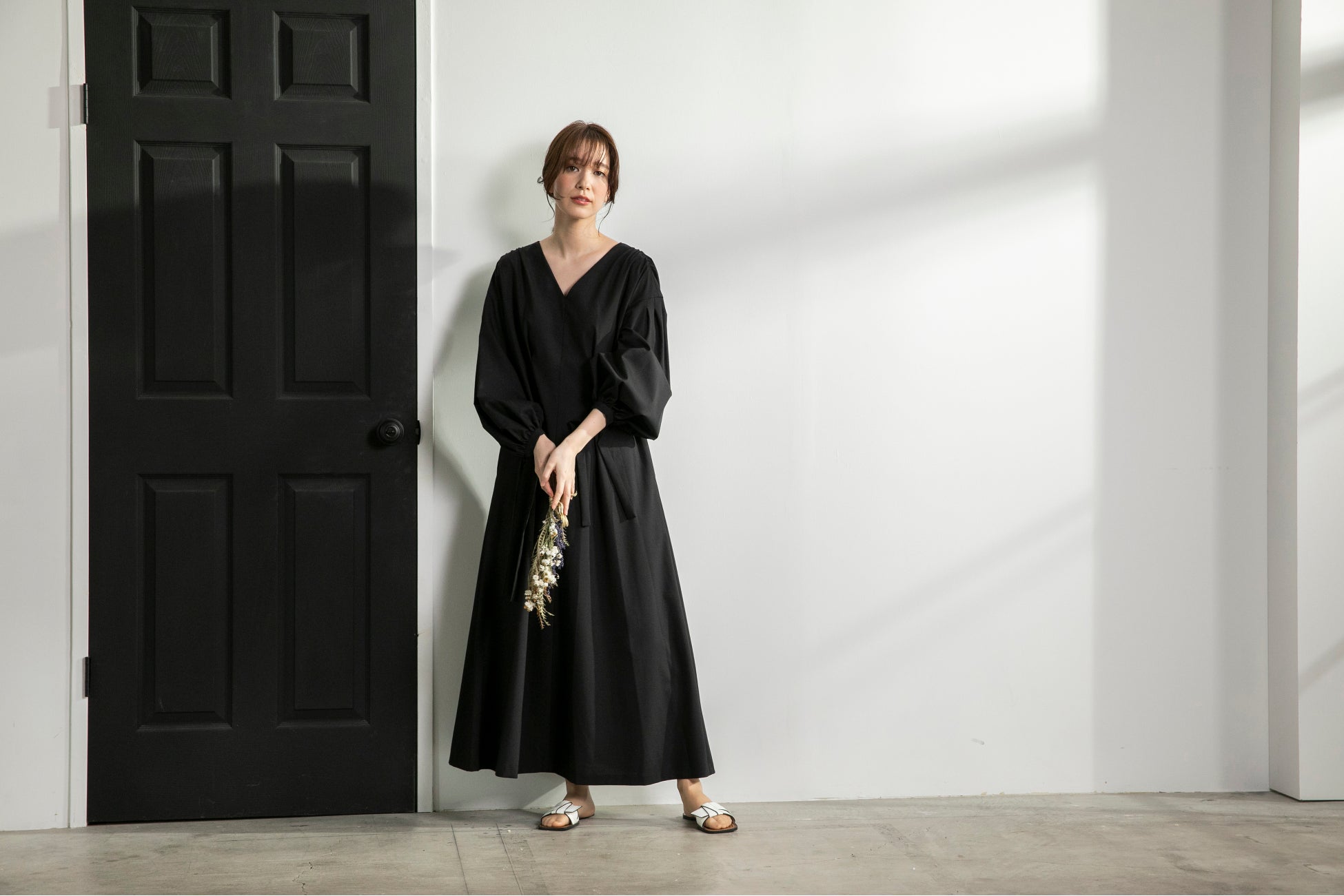 バルーンスリーブと長めの丈を組み合わせ、甘さとクールさの好バランスを実現したブラックドレス。価格:¥47,300