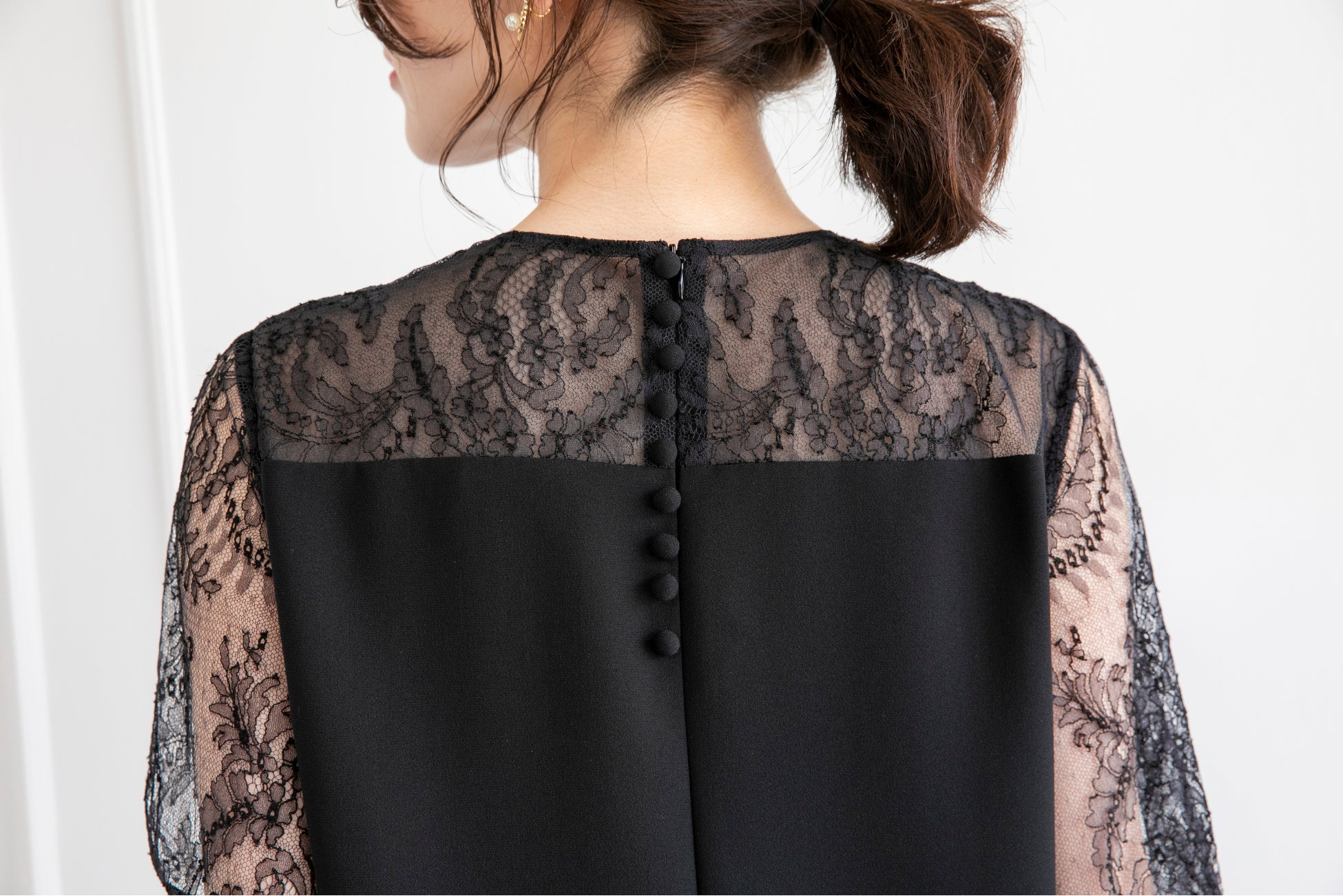 スリットを施し、動く度揺れるリバーレースが主役のスリーブドレス。 価格:¥58,300