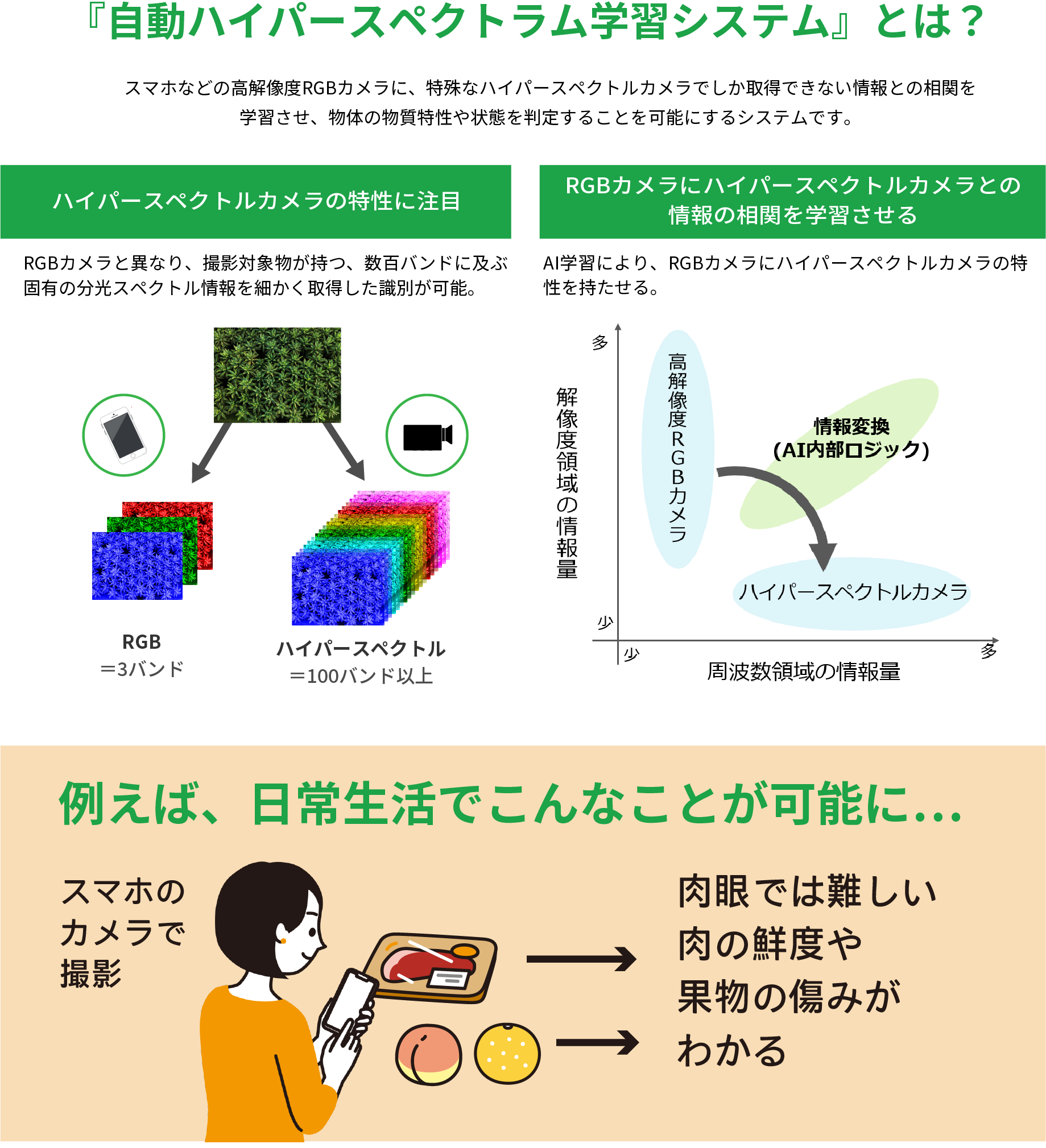 本システムは、ハイパースペクトルカメラでしか取得できない情報と、高解像度RGBカメラで取得できる情報の相関を学習し、高解像度RGBカメラでハイパースペクトルカメラの特性をAIで可視化する技術です。