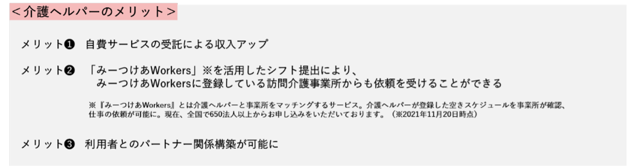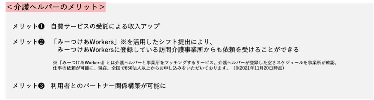 2020年4月には介護ヘルパーの人材不足解消および収入増を目的としたマッチングサービス『みーつけあWorkers』をリリースし、全国で650法人以上からお申し込みをいただいております。(※2021年11月20日時点)