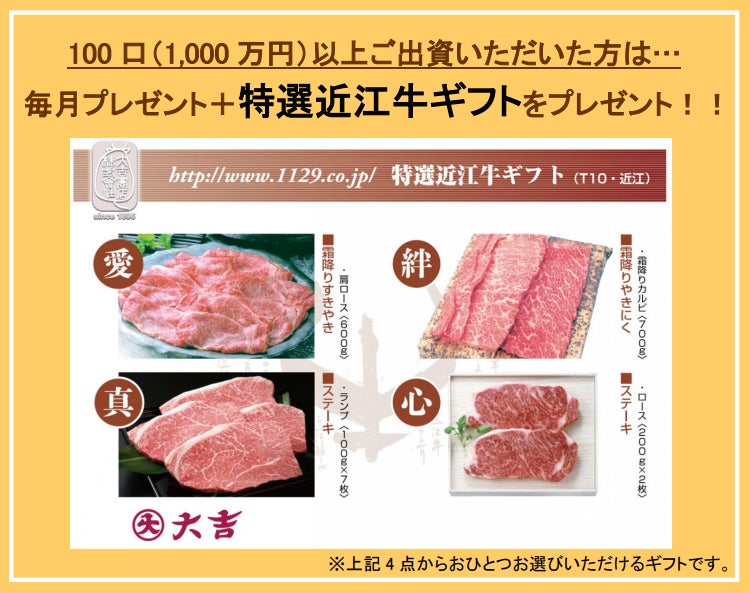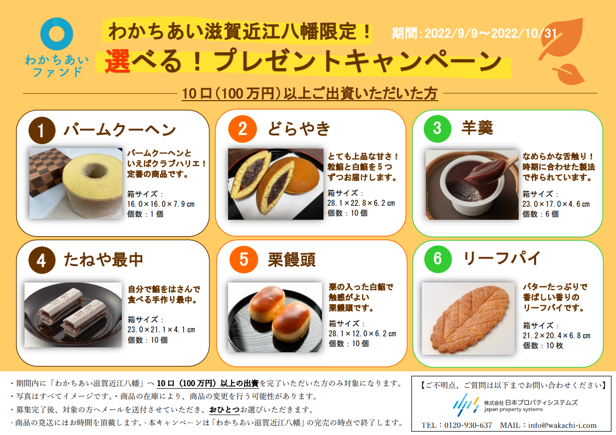 株式会社日本プロパティシステムズ(所在地:滋賀県大津市、代表取締役:森田康弘)は、2022年9月9日(金)12:00からインカム型ファンド「わかちあい滋賀近江八幡」の募集を開始します。出資者にはご当地商品をプレゼントします。