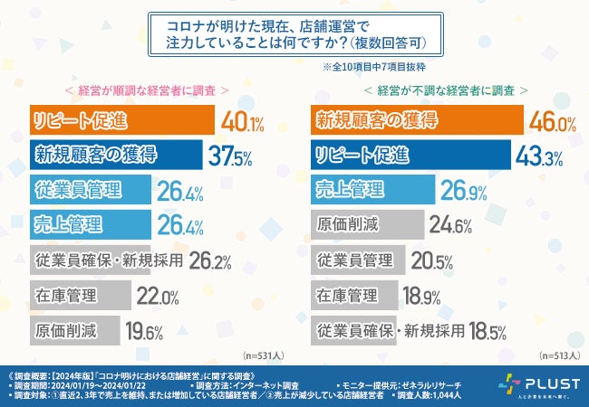 我々、株式会社プラストが2022年8月に実施した【2022年版】「コロナ禍での店舗経営」に関する調査(https://prtimes.jp/main/html/rd/p/000000015.000049109.html)では、長期化するコロナ禍の中でも、経営が順調な店舗とそうでない店舗の取り組みの違いが明らかになっています。