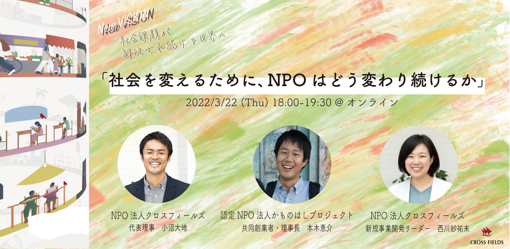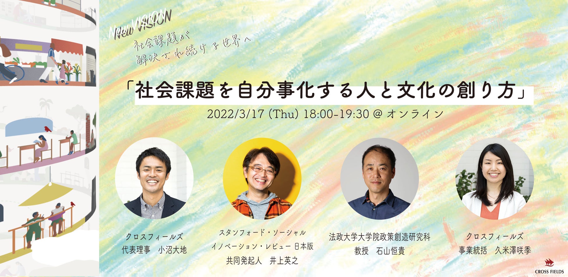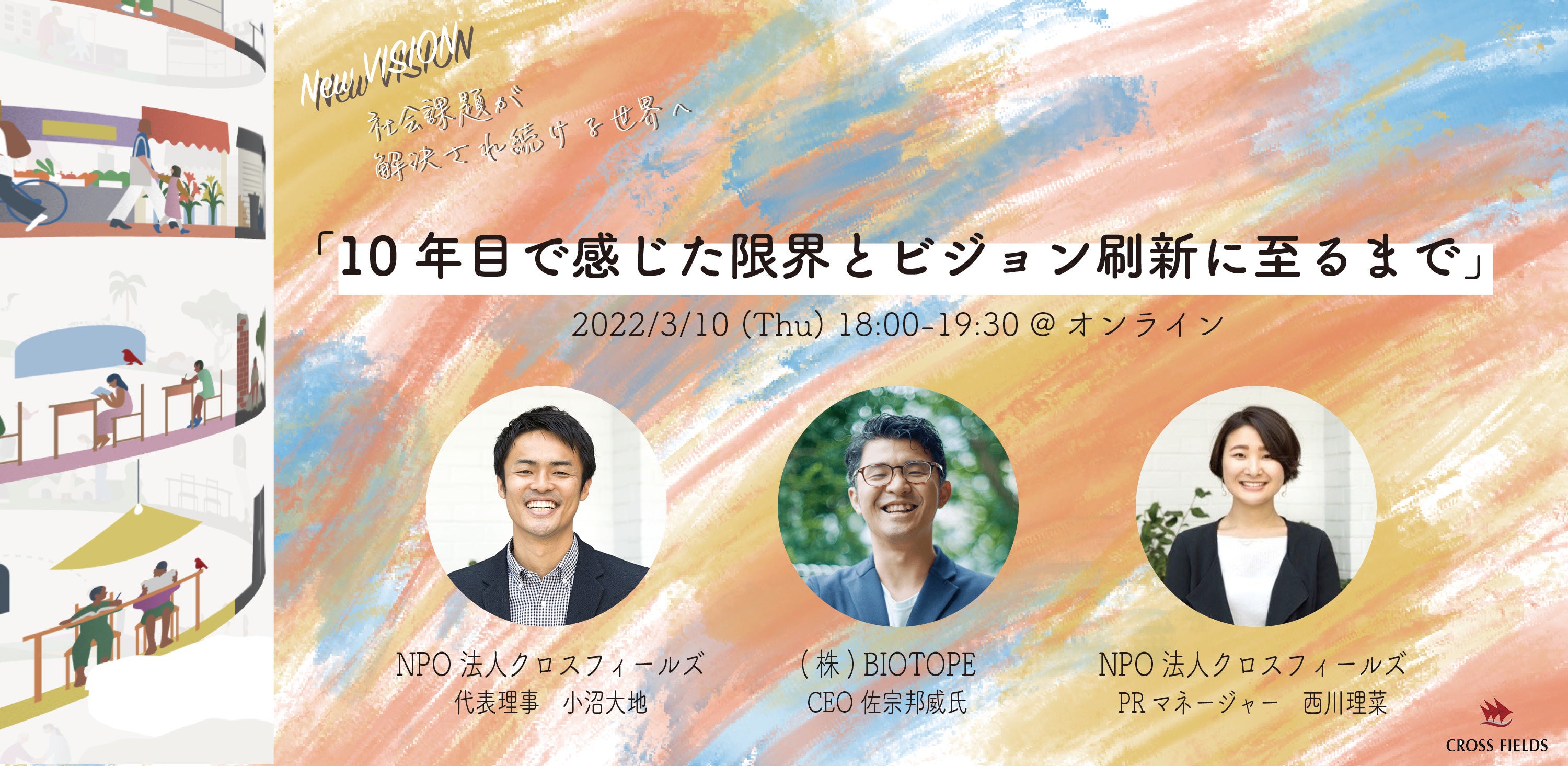 NPO法人クロスフィールズ(東京都品川区、代表:小沼大地)は2022年2月24日に団体ビジョン・ミッションを刷新したことをお知らせいたします。合わせて特設webサイト(日/英)と3月実施のオンラインイベントをご案内いたします。(参加費無料)