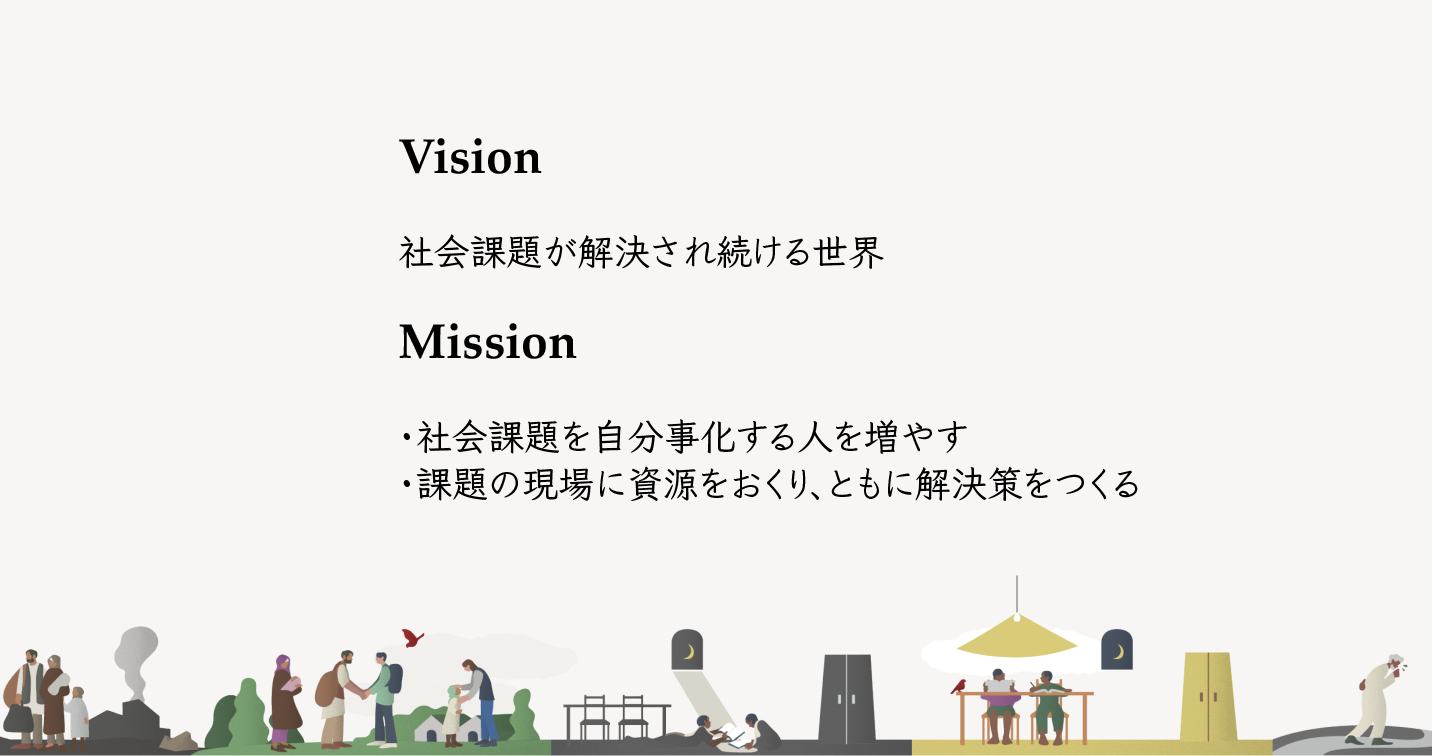 この現状を打破するため、創業10 周年の節目に「社会課題が解決され続ける社会」というビジョンを制定し、新たに進んでいくことを決意しました。本ビジョンの達成に向けて、留職などこれまでの活動で培ってきた「人へのアプローチ」をさらなるスケールで展開します。加えて「課題へのアプローチ」にも乗り出します。課題の現場が必要とするリソースを見極め、適切な資源を届けながら解決策を生み出していきます。