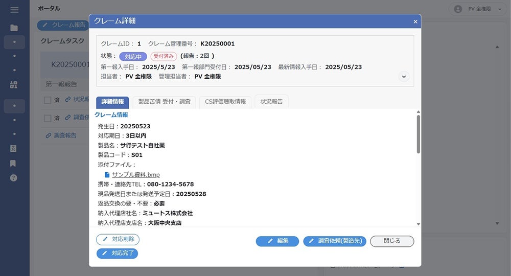 迅速な対応支援:クレーム情報の入力から調査、対応までの一連のワークフローを効率化し、顧客からのフィードバックに対する迅速な対応を支援します。