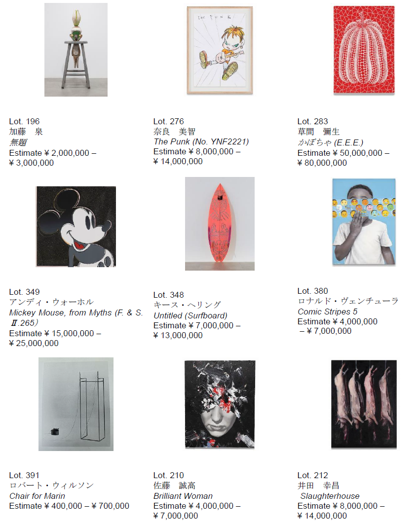 本セールでは、草間彌生「かぼちゃ」のアクリル画や、原始的な生命体を表した加藤泉の木彫作品をはじめ、奈良美智、KYNE、井田幸昌、今津景等、国内外のマーケットで注目されている作家の作品が出品されます。5月に開催のセールでも根強い人気を見せた日本の戦後美術からは、今井俊満や堂本尚郎らの作品が登場。1950年代の戦後美術から最先端のアートシーンを率いるウルトラコンテンポラリーまで、多種多様な作品が揃います。海外作家からは、ポップアートの巨匠アンディ・ウォーホルがアメリカン・カルチャーの象徴であるミッキーマウスをモチーフにした貴重なシルクスクリーン作品や、キース・ヘリングが初来日した1983年に、現所有者の目の前で描いてもらったという秘蔵のサーフボードが出品。その他1993年ヴェネツィア・ビエンナーレ金獅子賞受賞作品という希少な来歴をもったロバート・ウィルソンの「Chair for Marin」等、当社初紹介となる作家にも注目が集まります。