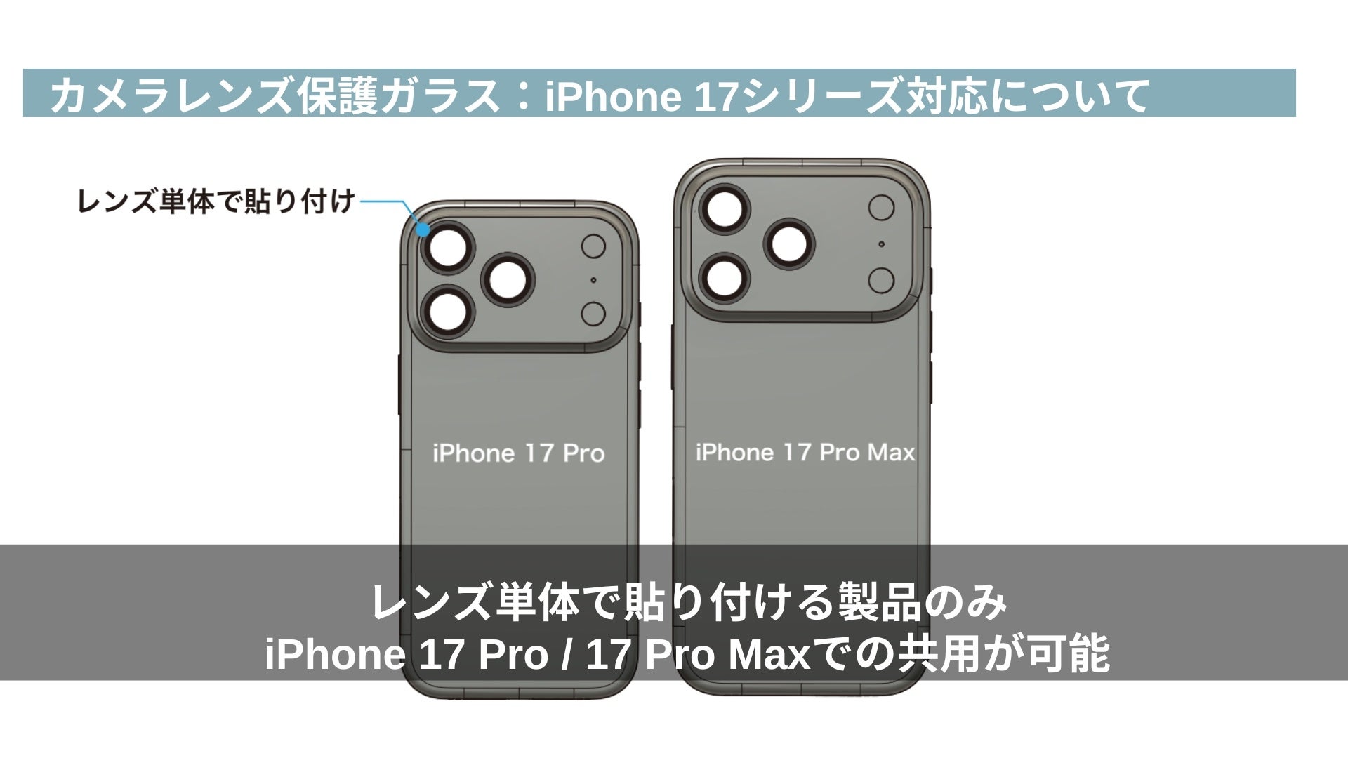 ただし、レンズ部分を独立してカバーするタイプの独立型カメラレンズ保護ガラスに関してはiPhone 17 Pro、iPhone 17 Pro Max間で共用可能です。