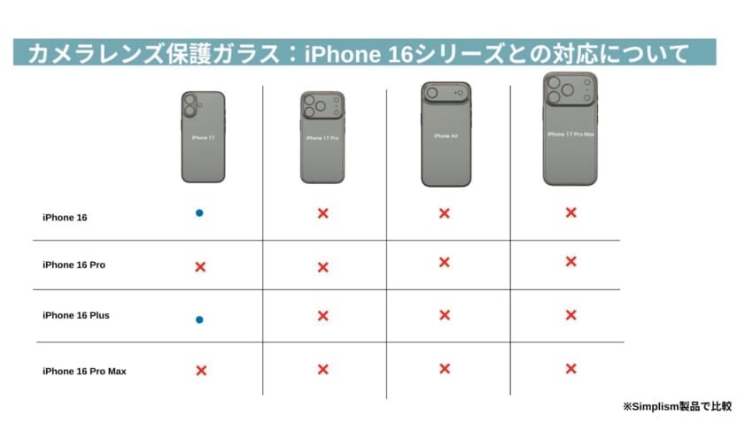 iPhone 17、iPhone Air、iPhone 17 Pro、iPhone 17 Pro Maxは背面カメラも形状やサイズが違うため、Simplismではそれぞれの端末形状に合わせた専用のカメラレンズ保護ガラスを製作しました。それぞれの端末に合わせて専用のものをご利用ください。