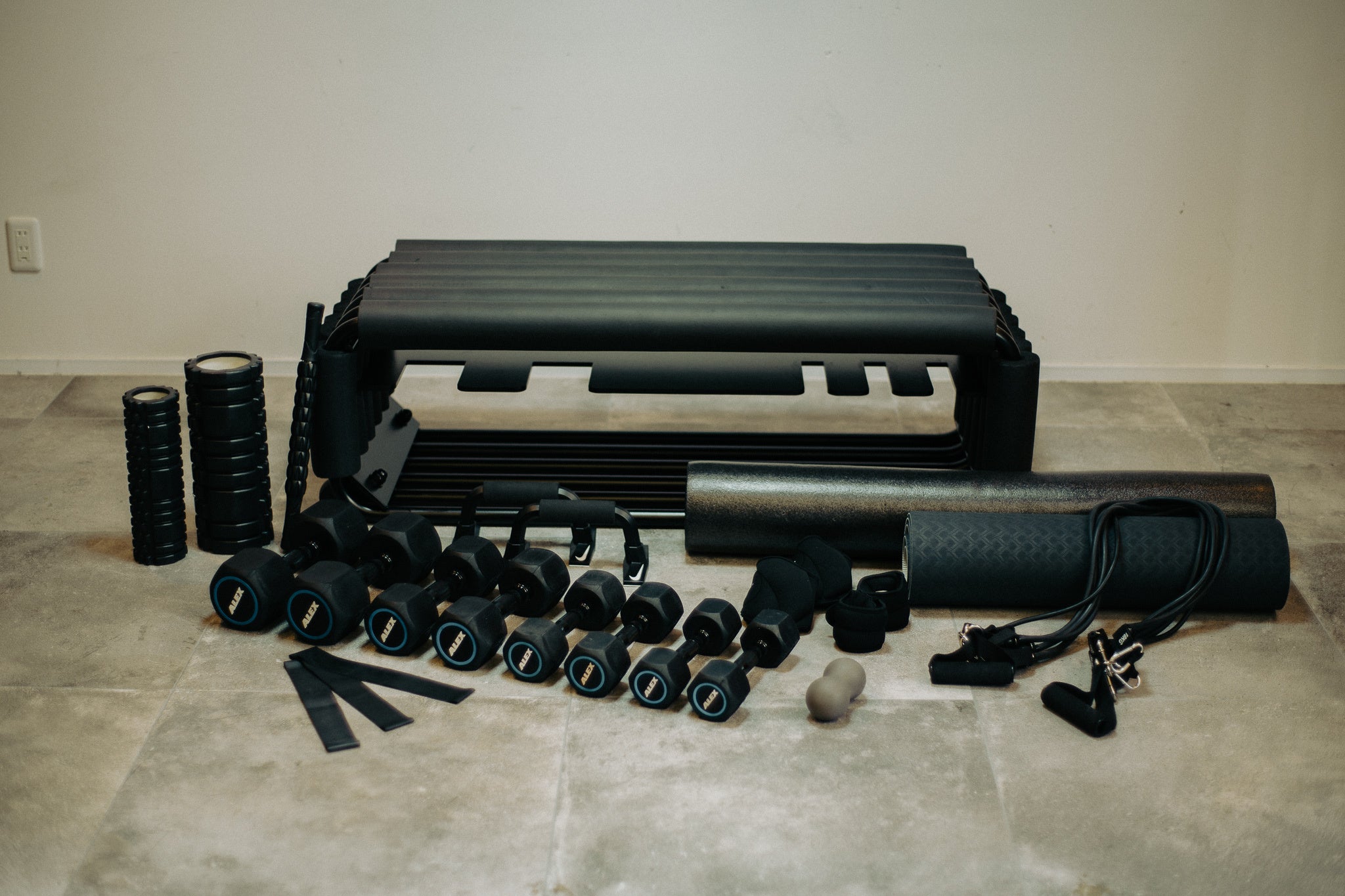 「Minimal gym」は、忙しい現代人により日常の中で運動に触れる機会を持ってもらいたいという思いで誕生したキットです。最小単位のジムとして、プロのトレーナーたちが選び抜いた器具がひと通りそろっています。1.5m四方のスペースがあれば、オフィスや廊下など、空いたスペースを運動の場として活用いただけます。
