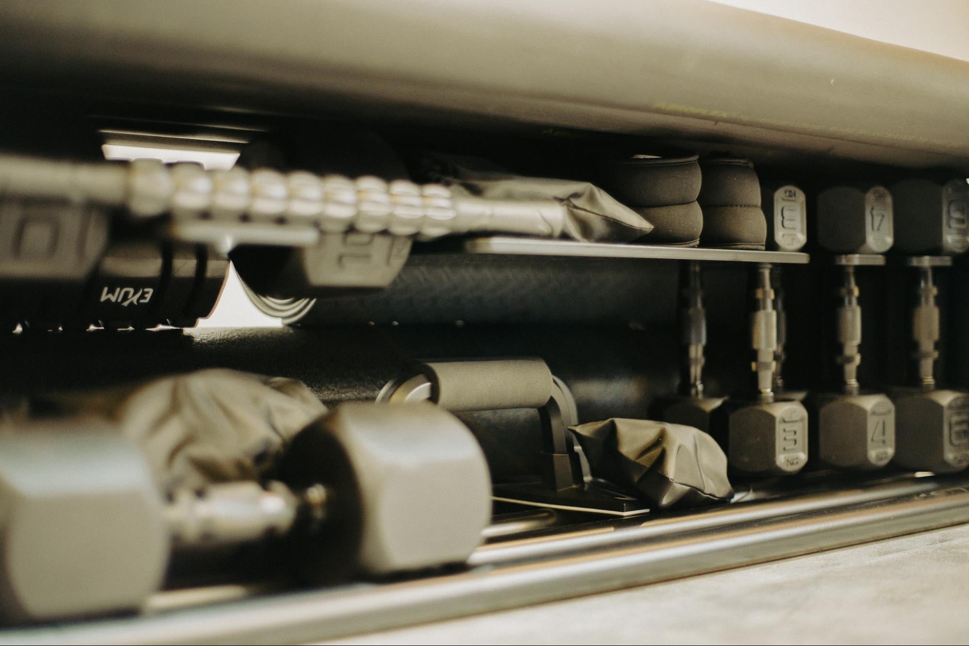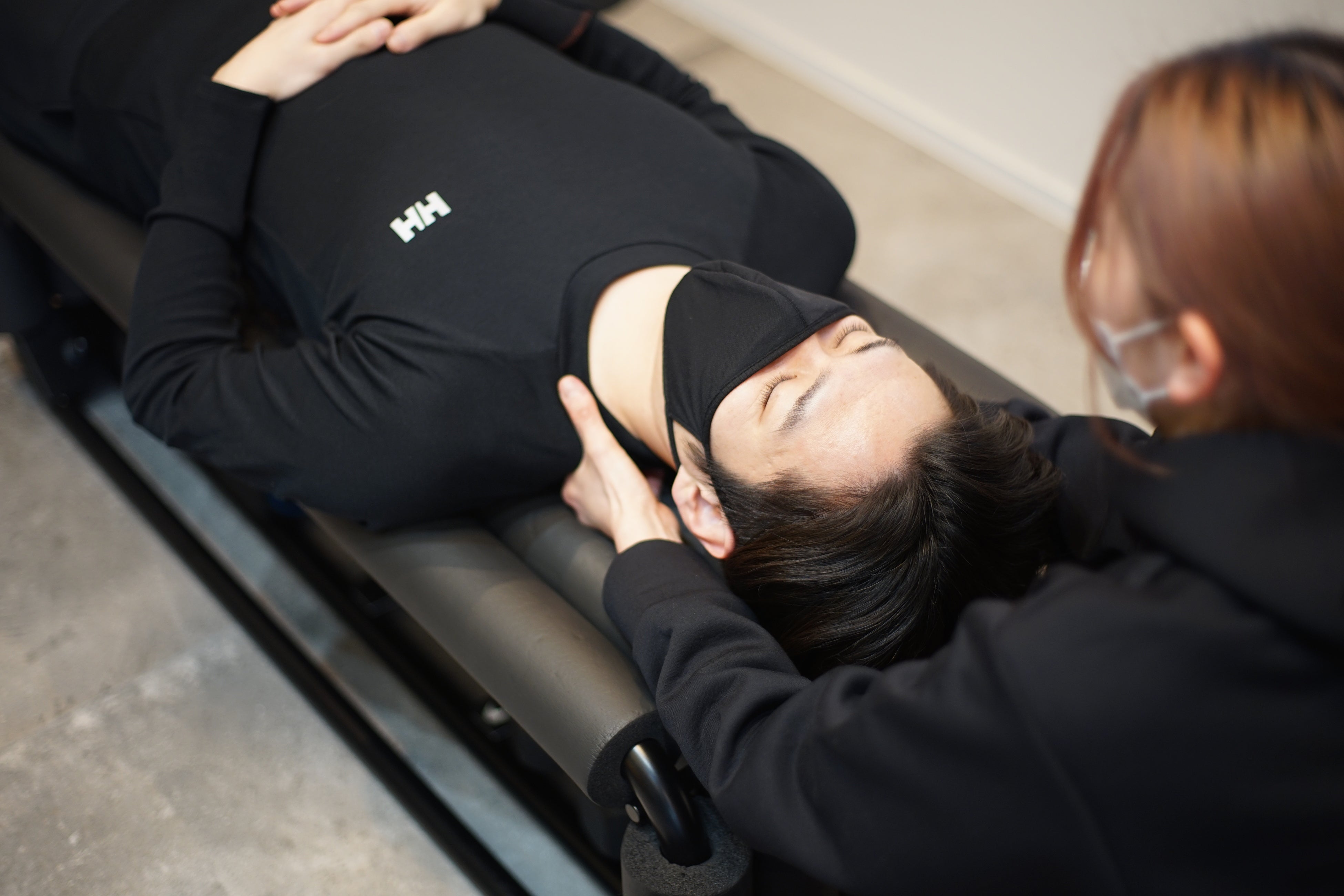 Minimal gymにはストレッチや筋膜リリースなど体をほぐせるアイテムも充実。収納フレームは簡易ベッドにもなり、トレーナーの施術台としても活用可能です。デスクワークで固まりがちなカラダを健康に保つには、ケアをこまめに取り入れることが大切。仕事終わりや休憩時間に、ほんの少しストレッチの時間を取り入れるだけで、肩こりや姿勢の改善につながります。