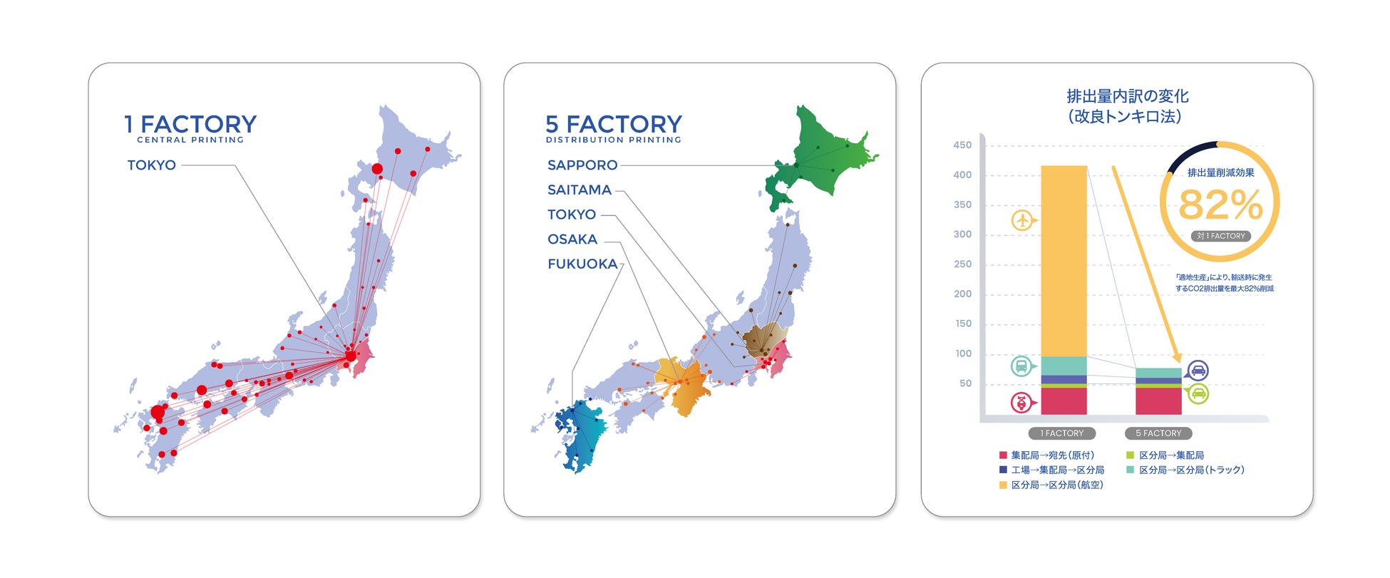 本実証実験では、パイオニアが保有するルーティング技術とグーフのデジタルプリントプラットフォームを使用した適地生産ロジックを使用した場合のCO₂排出量削減効果の可視化と、その有用性の精査・検証を行います。第一弾として、実在するEC企業のデータを基に実施したDM(ダイレクトマーケティング)輸送時のシミュレーションでは、適地生産(1拠点→5拠点)を行った場合に最大82%のCO2削減が見込めることが分かりました。