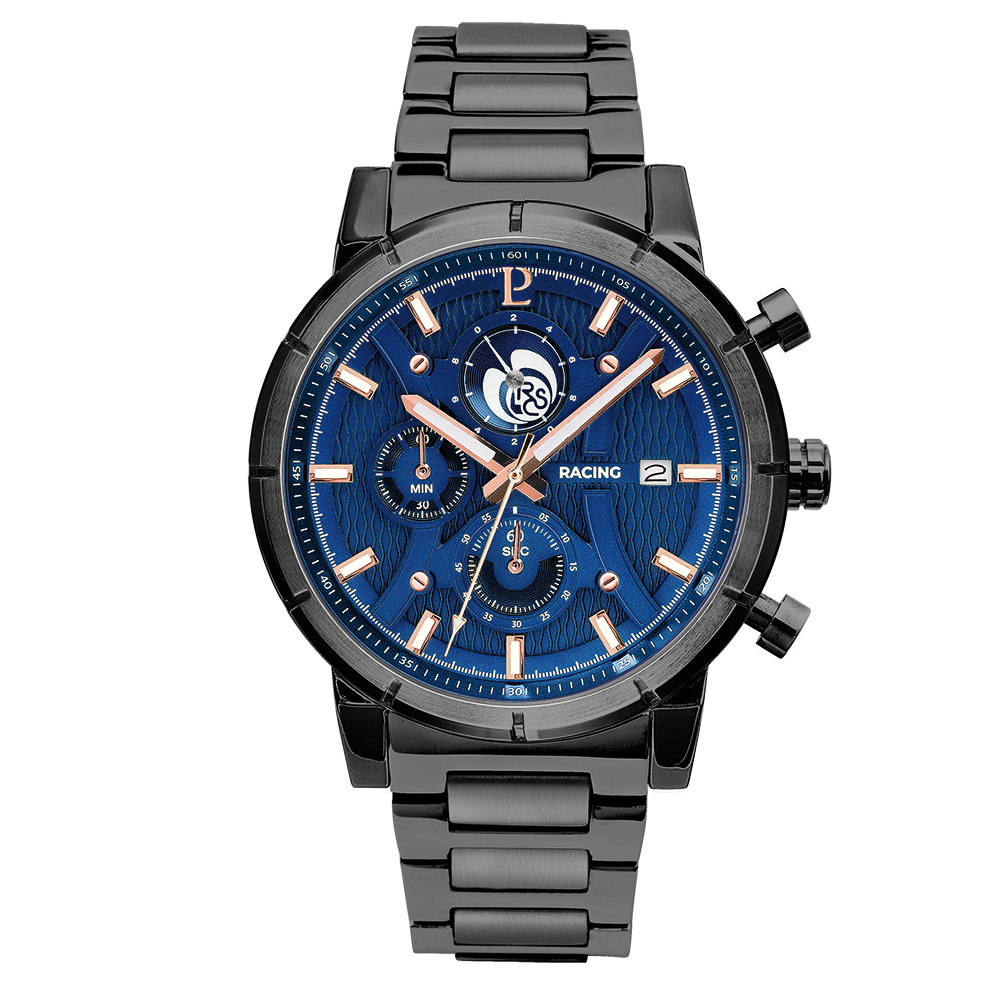 黒いメタリックなケースにフレンチブルーの文字盤が、ピエールラニエらしい配色。