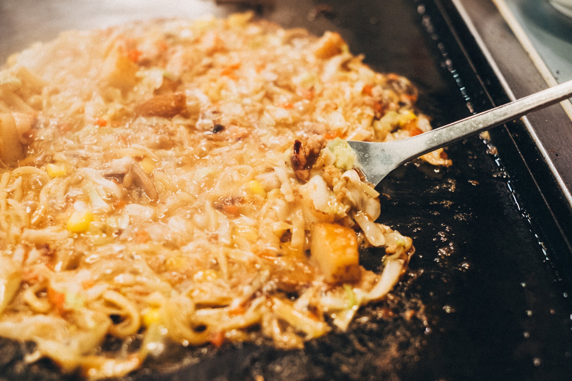 プロの焼き手がすべて目の前の鉄板で焼き上げてくれるので、初めてでも安心して楽しめる。