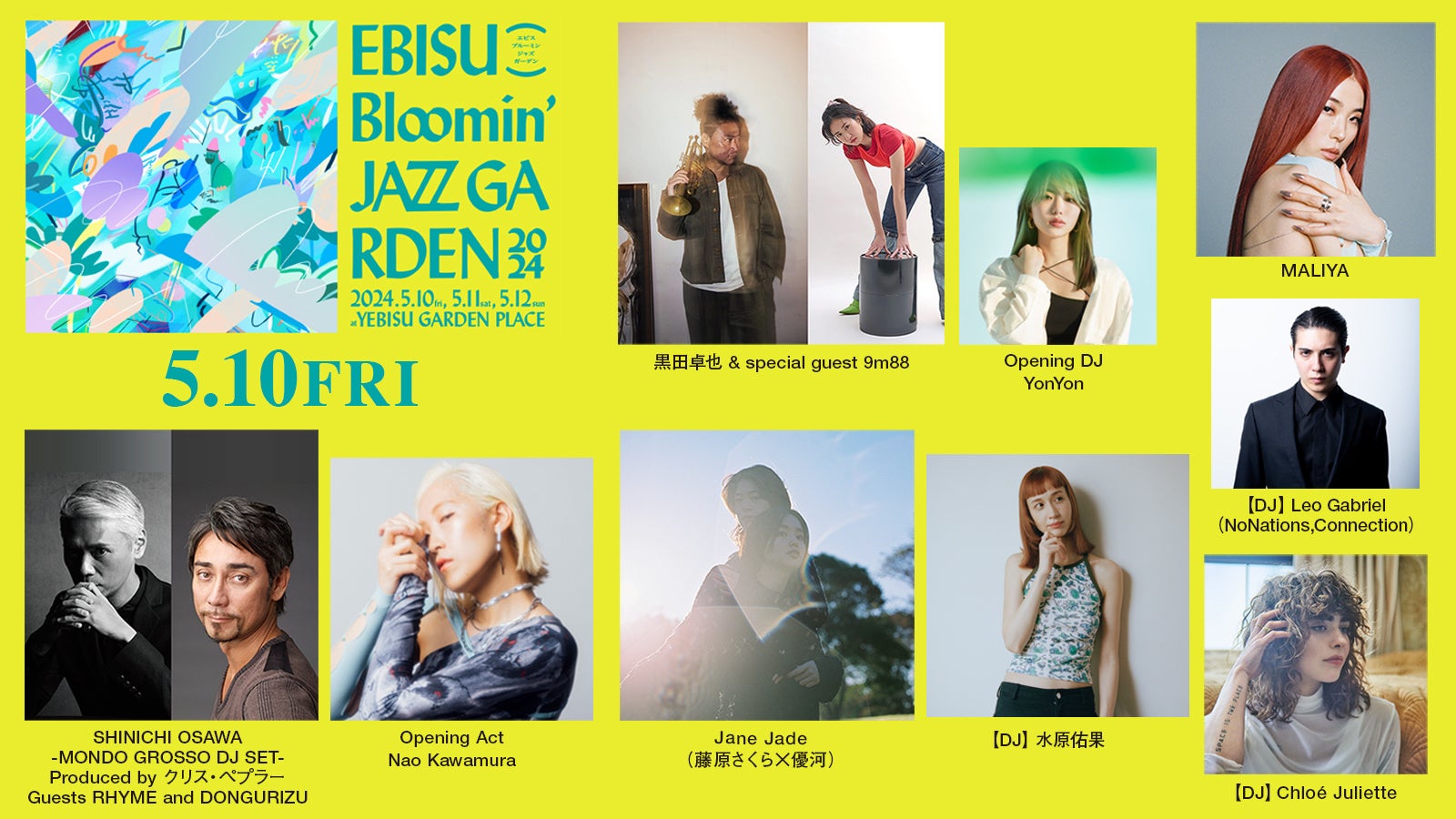 初日を飾るヘッドライナーとして、ニューヨークで活動する黒田卓也(tp)が台湾のスターR&Bシンガー・9m88(ジョウエムバーバー)を迎えザ・ガーデンホールに登場いたします。ザ・ガーデンルームではクリス・ペプラープロデュースによる大沢伸一率いるMONDO GROSSOが贈るスペシャルなDJセットや、BLUE NOTE PLACEでは大人気R&BシンガーMALIYAのステージをお楽しみいただけます。センター広場(※入場無料)では藤原さくらと優河によるユニット・Jane Jade がフェスティバルの開幕を告げるGRAND OPENING ACTとして出演する他、ファッション・アイコンとして支持を得る水原佑果によるDJプレイも必見です。さらに時計広場(※入場無料)では、フランス出身、幅広い選曲が定評のDJ・Chloé Julietteが登場。フリーエリアだけでもたっぷりと楽しめる内容となっています。