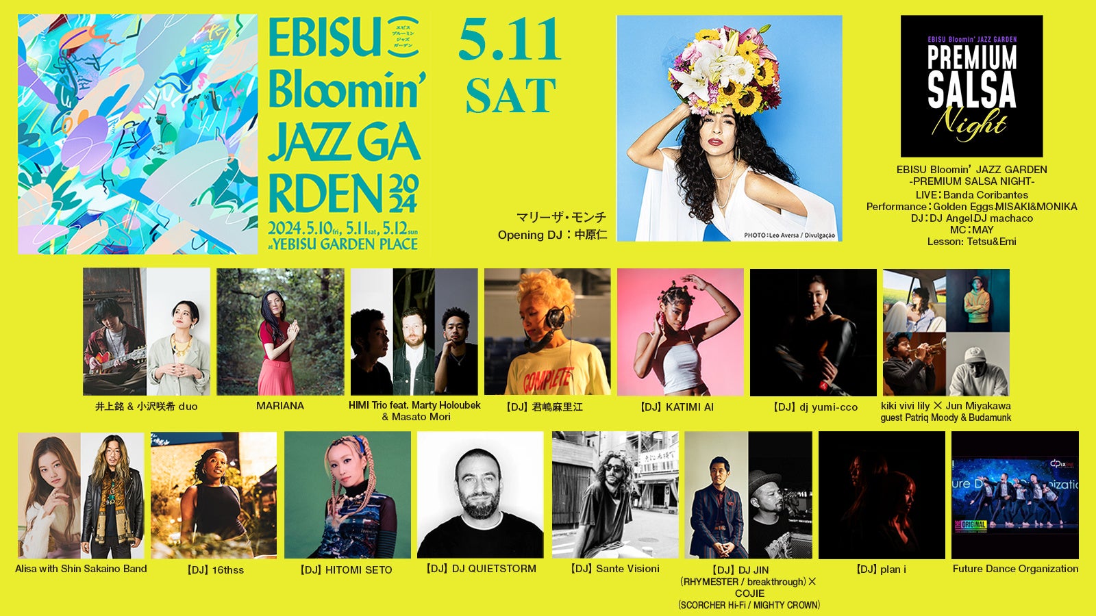 センター広場のDJは、ジャズ/ラテン/ブラジル/レアグルーヴを主体に選曲する君嶋麻里江、アフロ・ハウスを中心にゆるりとラウンジセットを披露する予定のKATIMI AI、ジャンルに偏らず縦横無尽な選曲が定評のdj yumi-cco。同広場で、現在の若手ジャズシーンの中心的存在のカリスマ・井上銘と、今夏はフランスのフェスにも出演予定と活躍が目覚ましい小沢咲希の2人が、同じレーベルからリリースしていながら意外にも初共演を果たします。また、日本国内では数えるほどしかライブを披露していない才色兼備の日系ブラジル人シンガー・MARIANAが登場。今月カンヌ国際映画祭でも実演予定の話題の生花アーティスト・萩原亮大との共演で、広場をどのようなBloomin’ JAZZ GARDENに仕立てるのか、ぜひ会場で体感してください。さらに、俳優としても人気のHIMIがMarty Holoubek(b)、Masato Mori(ds)とトリオで極上のチルサウンドを披露いたします。