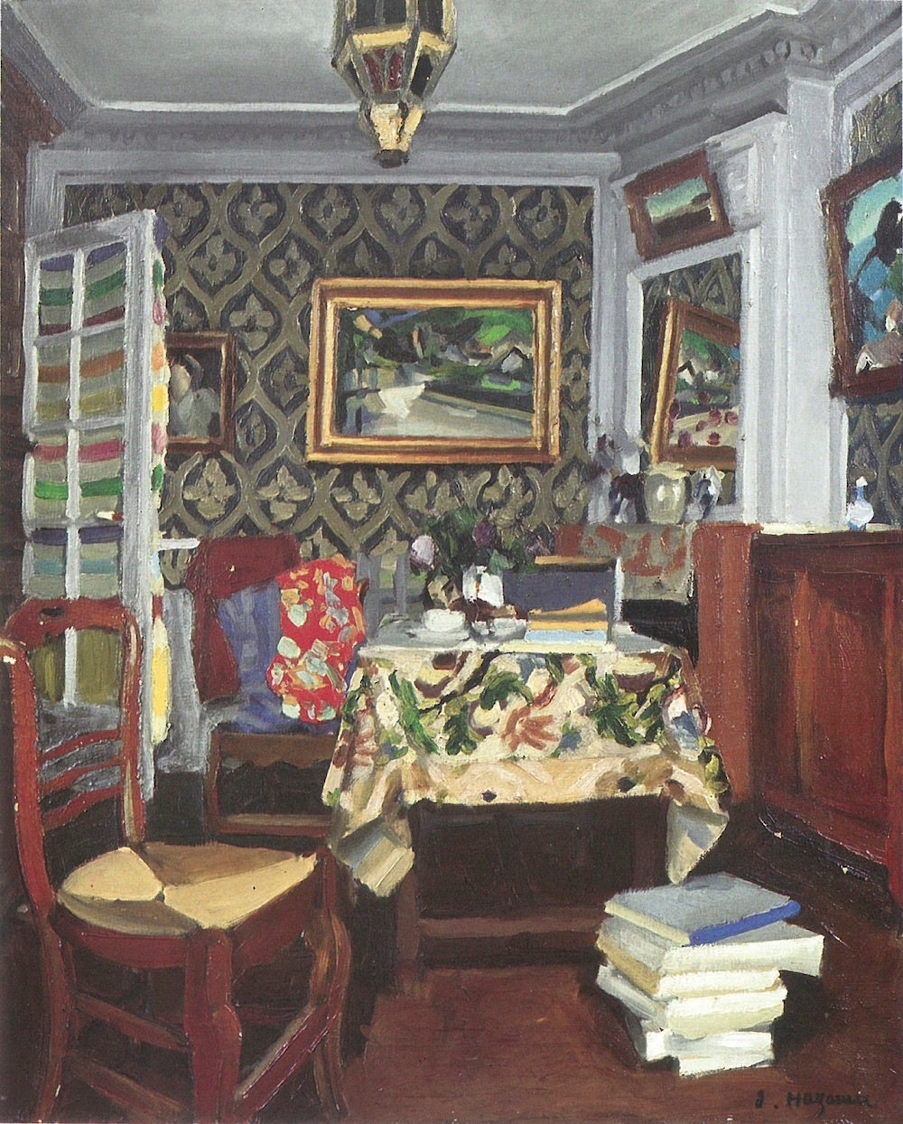 硲の《室内》(1928年)には、自身の作品に加え、収集したコローの作品が描かれています。現在、当館に収蔵されるマティス《コリウール》(1905年)とルソー《イヴリー河岸》(1907年頃)は、硲が絵の研究のために滞欧中に購入した作品です。また、当館の創設者である石橋正二郎がセザンヌ《サント=ヴィクトワール山とシャトー・ノワール》(1904-06年頃)とマティス《縞ジャケット》(1914年)を入手する際にも関わったと伝えられています。