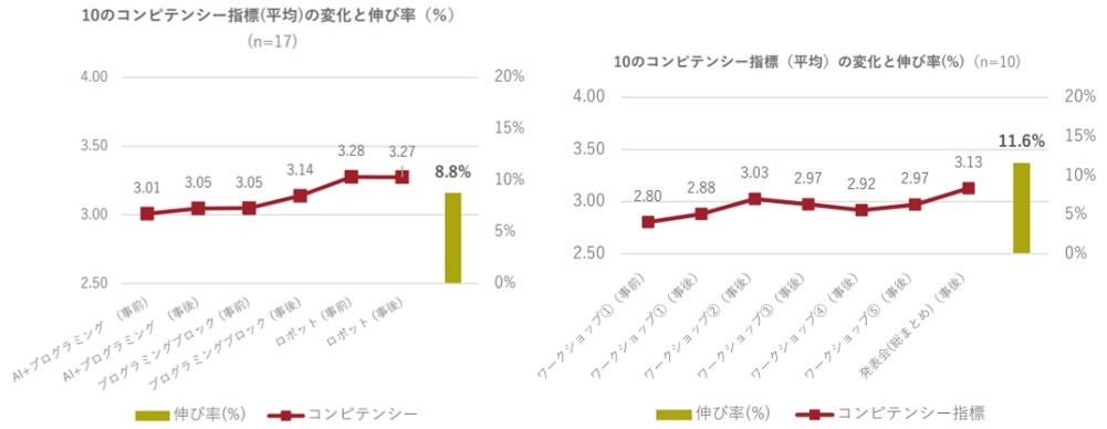 ・単発プログラム全体の評価指標(10のコンピテンシー指標)の変化については、事前の平均値が3.18なのに対して、事後の平均値は3.33となり、伸び率は4.6%でした。また、すべてのコンピテンシー指標においても向上していることが確認されました。