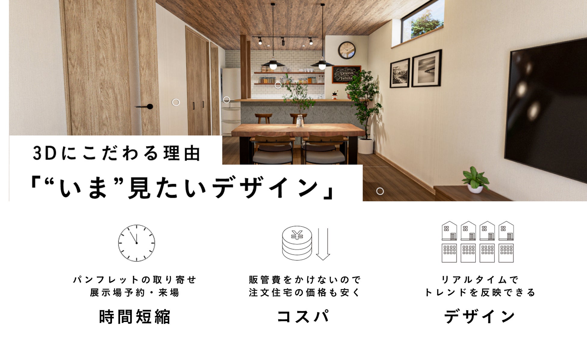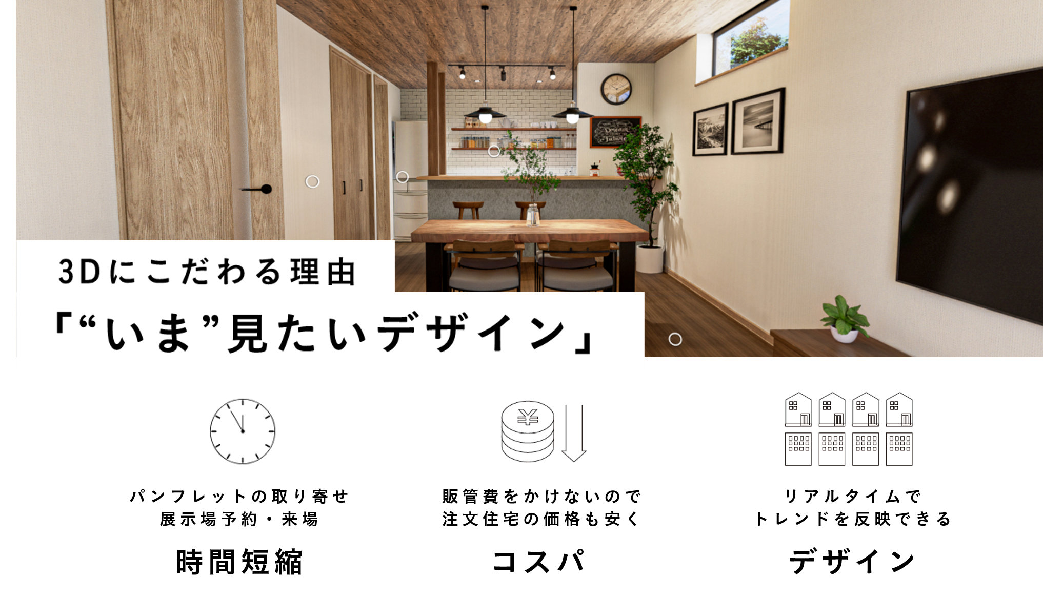 展示場やモデルハウスは建築に長い時間がかかり、最新トレンドを取り入れていくことが困難です。既設の展示場やモデルハウスを画像化するのではなく、一から 3D データでデザインを作り込むことで、スピーディーにお客様のご要望やトレンドに合わせた多様なデザイン住宅をご提案することが可能です。