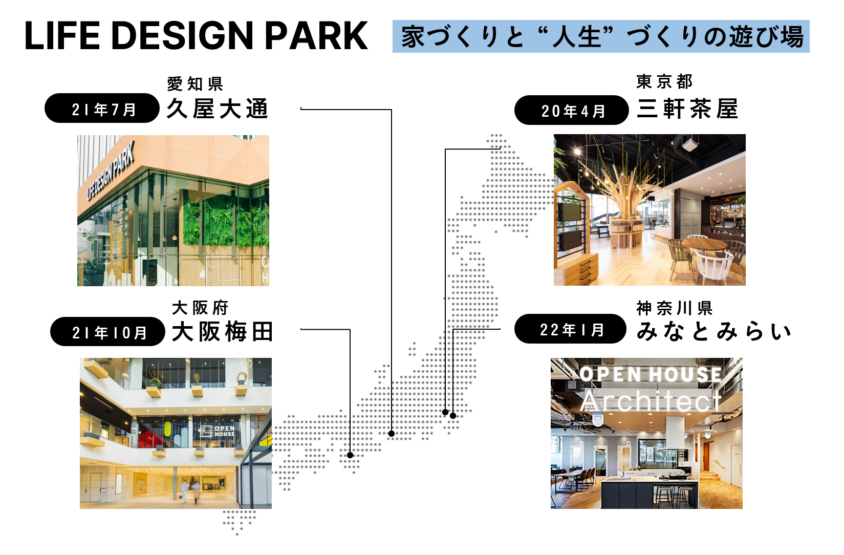 オープンハウス・アーキテクトは、自由設計ニーズに対応すべく、リアル店舗「LIFE DESIGN PARK」を東京・神奈川・愛知・大阪に出店しています。憧れの暮らしのイメージを膨らませ、家づくりの楽しさを感じていただけるよう、様々な参考インテリアと人気設備の展示が施された「注文住宅」のコンセプトショップです。