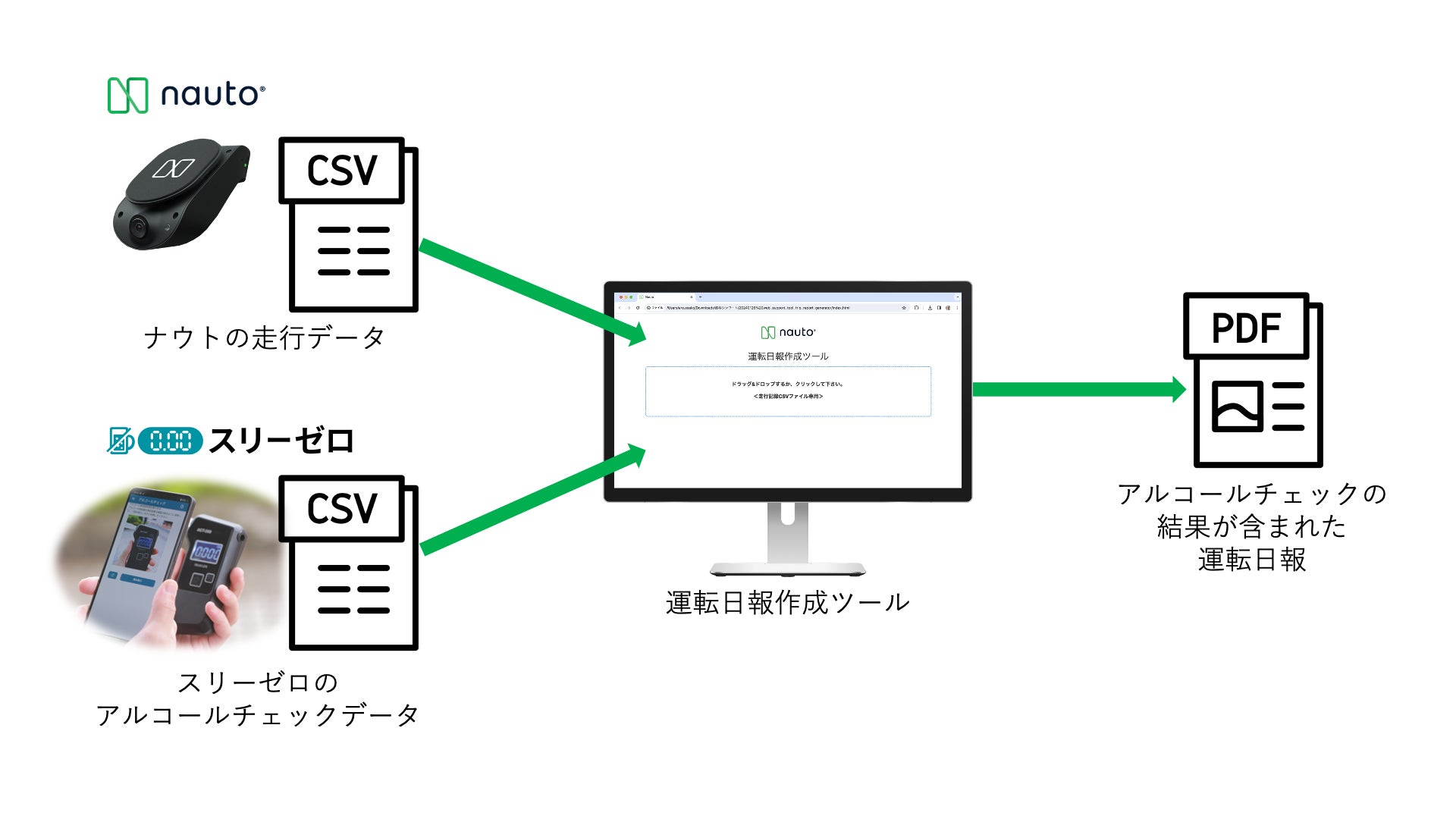 このたびのサービス連携では、Nautoが2024年2月1日にリリースした運転日報作成ツールをアップデートし、ナウトから出力された走行データと、スリーゼロから出力された検査記録を統合した、アルコール検査結果入り運転日報の作成を実現。スリーゼロがサポートする65社117機種(2024年3月4日時点)のアルコール検知器を使用したアルコールチェックのデータを統合できるようになりました。