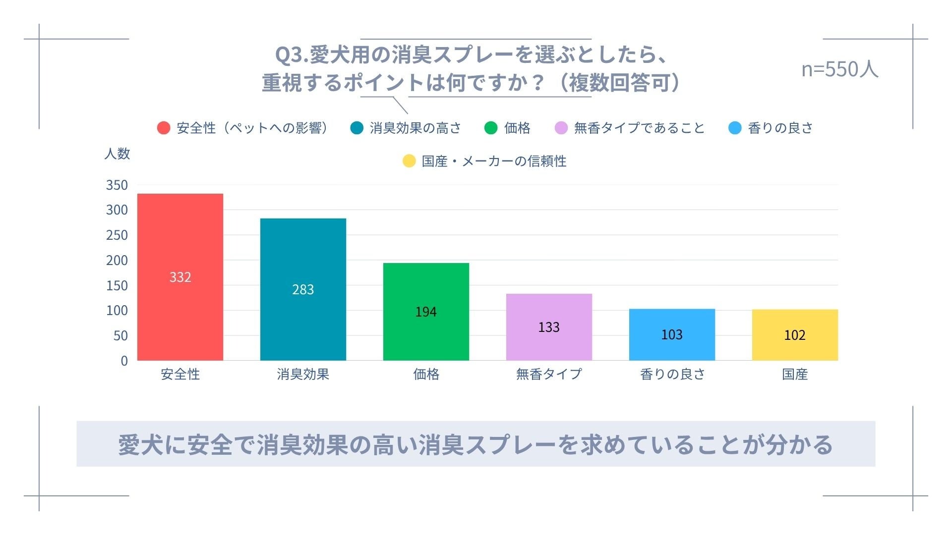 一方で、消臭スプレーを選ぶ際には「安全性」と「消臭効果の高さ」を重視する傾向が強く、ペットや家族に安心して使える製品を求める意識が高いことが分かりました。