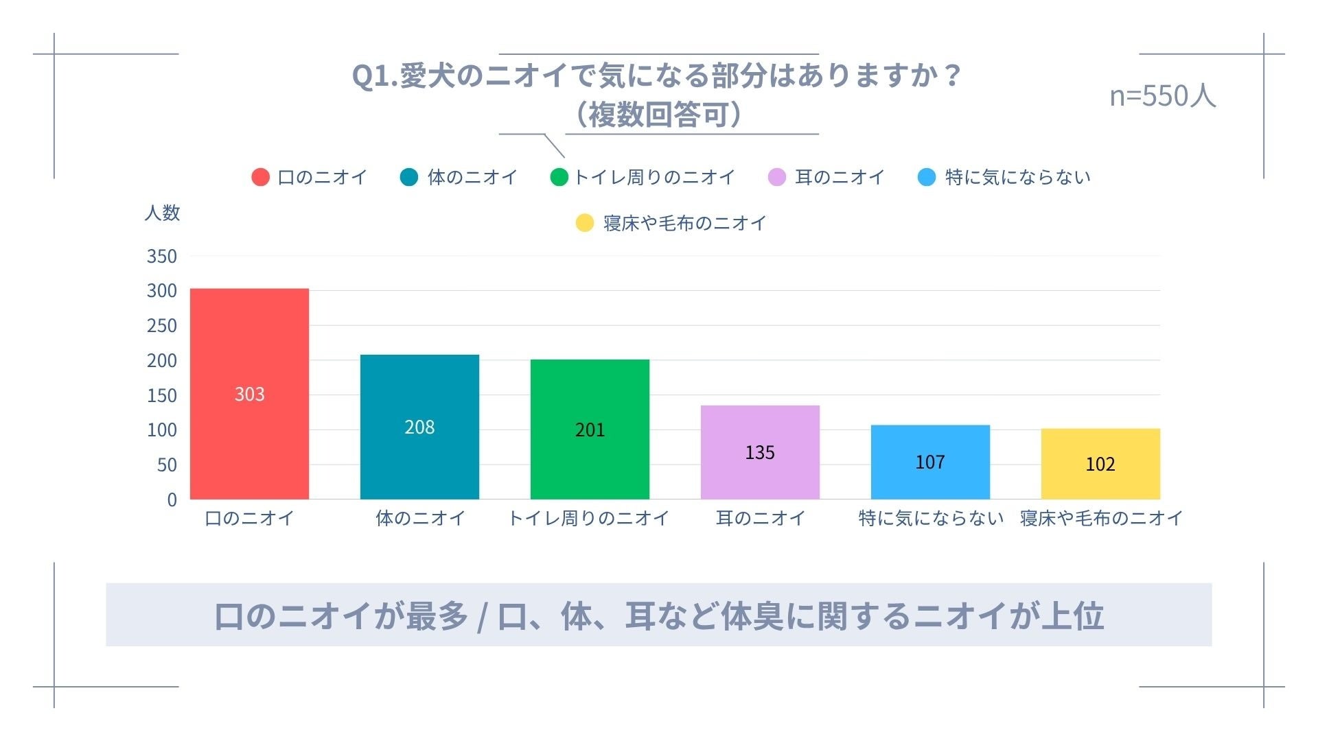 今回のアンケートから、愛犬家の多くが「口のニオイ」や「体臭」「トイレまわりのニオイ」など、日常的に発生するニオイに悩んでいる実態が明らかになりました。