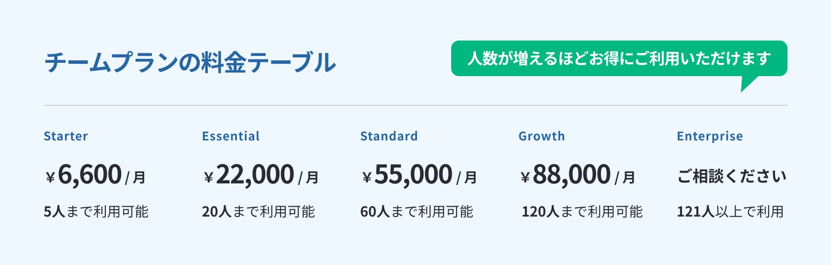 「チームで連携して活用するために人数が増えるたびに予算の見直しをするのではなく、会社の規模に合わせて、ある程度固定の料金で利用したい」というクローズドβユーザーの皆様のご要望にお応えできる料金体系に変更いたしました。