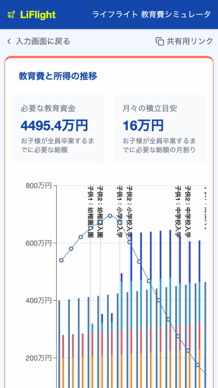 「AIチャットもいいけど、数字やグラフでもっと具体的に考えたい!」そんな声から誕生したのがこの「ライフライト 教育費シミュレータ」です。