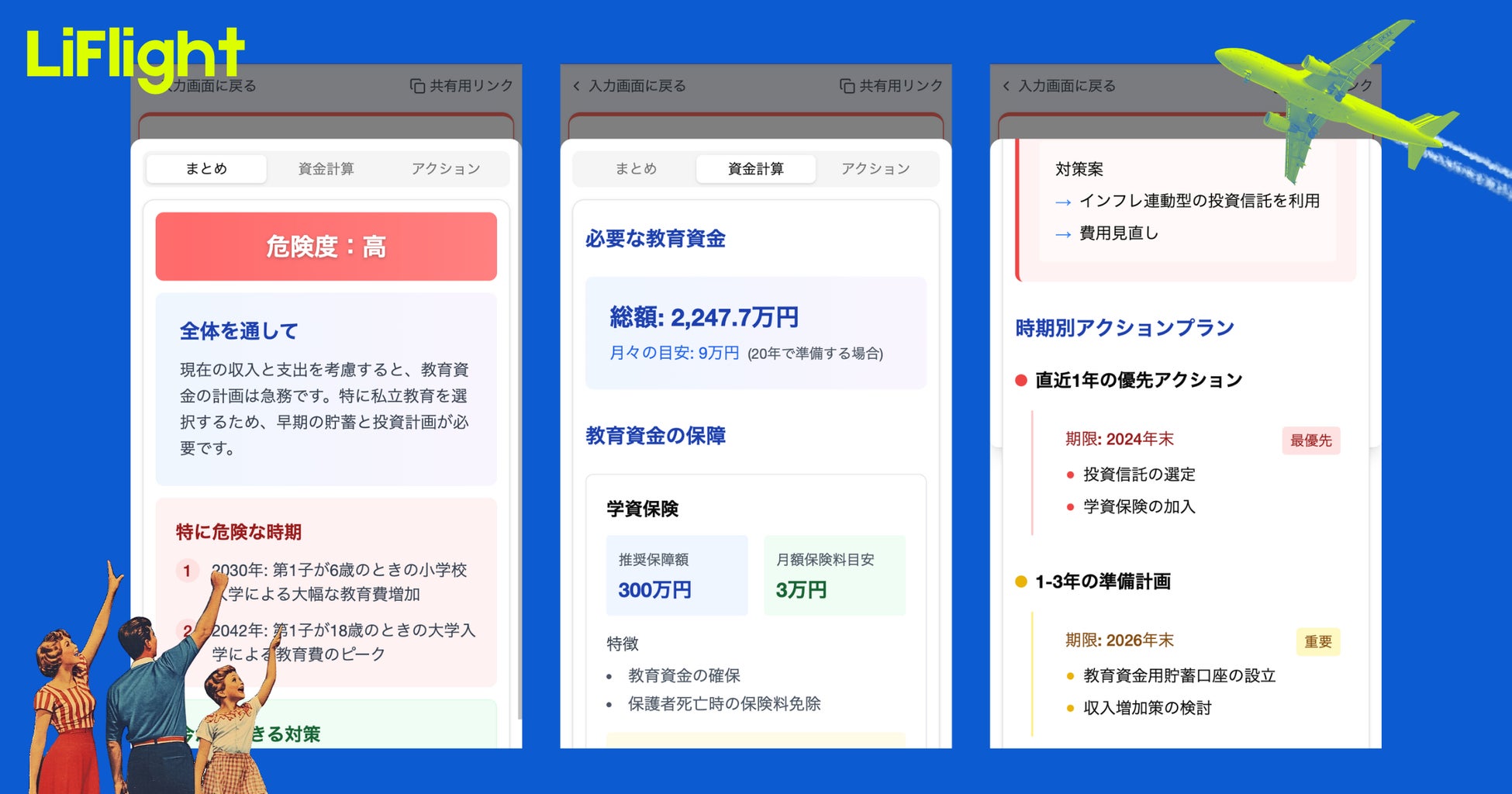 ライフライトは、単なる計算機ではありません。シミュレーション結果をもとに、ライフプランニングAIエージェントが「まとめ」「資金計算」「アクション」の3カテゴリで具体的な計画立案を行います。