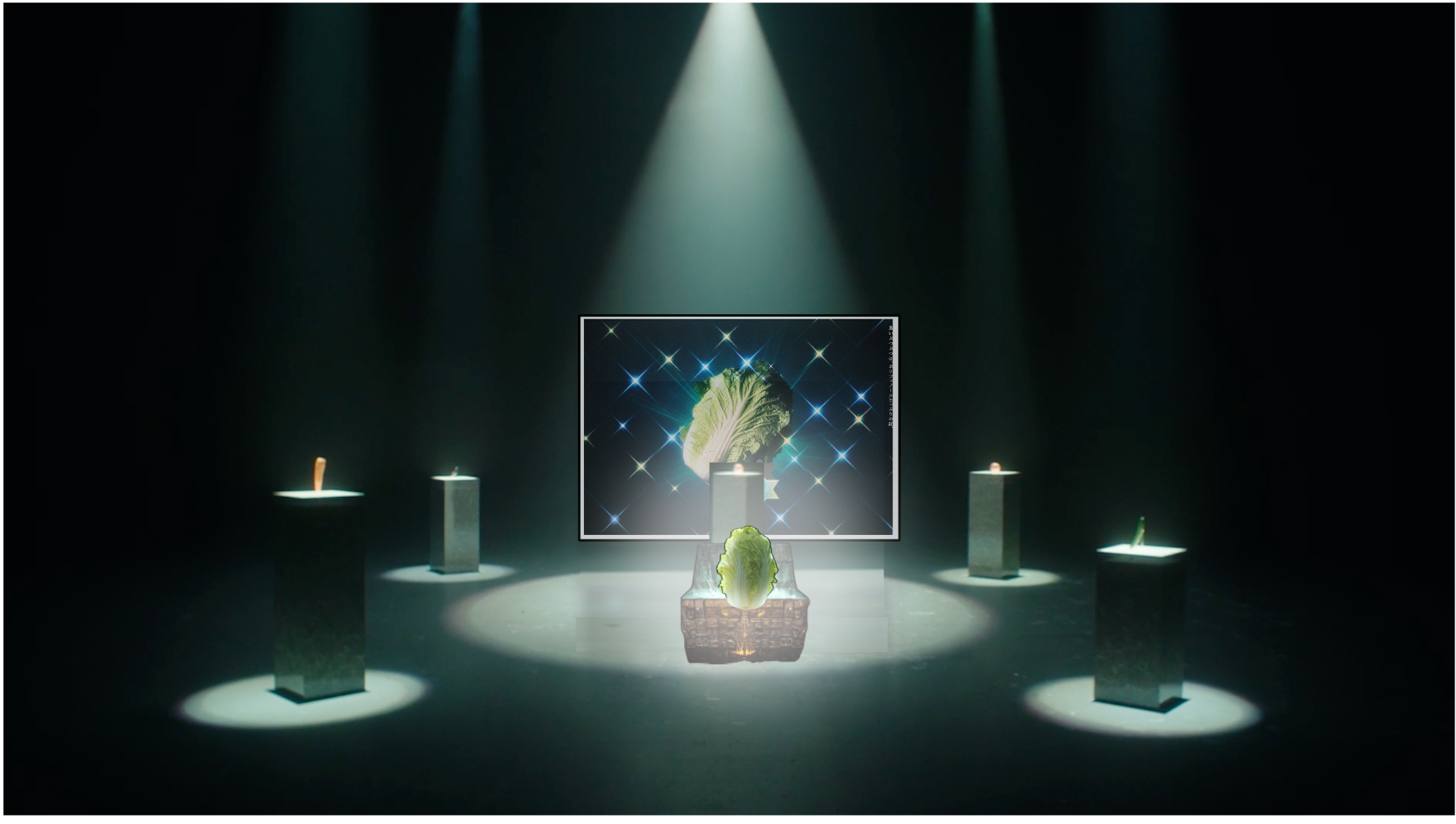 隠れたレアな存在であることを示すように宝飾品のように飾られた『隠レア野菜』の数々を実際にご覧いただけるギャラリーとなっております。ギャラリー内では『隠レア野菜』を手に取るアクションに連動した光による象徴的な演出で『隠レア野菜』との出会いの貴重さを疑似体験できるアトラクションもご用意。