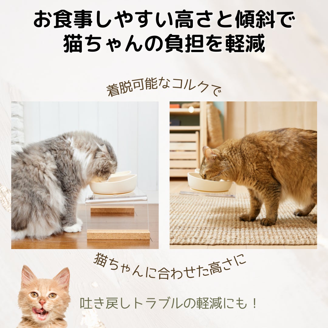 アクリル製フードスタンド「nyamsta!」は、程よい高さと傾斜で猫ちゃんのお食事の負担を軽減。ベビーグレードのシリコン製食器はお髭が邪魔になりにくいよう間口を大きく取っており、お食事中の食べこぼし予防にも役立ちます。コルク製の台座は、お食事中の床滑り防止や、床面へのキズ防止だけでなく、取り外すことで猫ちゃんの性格や体格に合わせて高さを微調整していただけます。