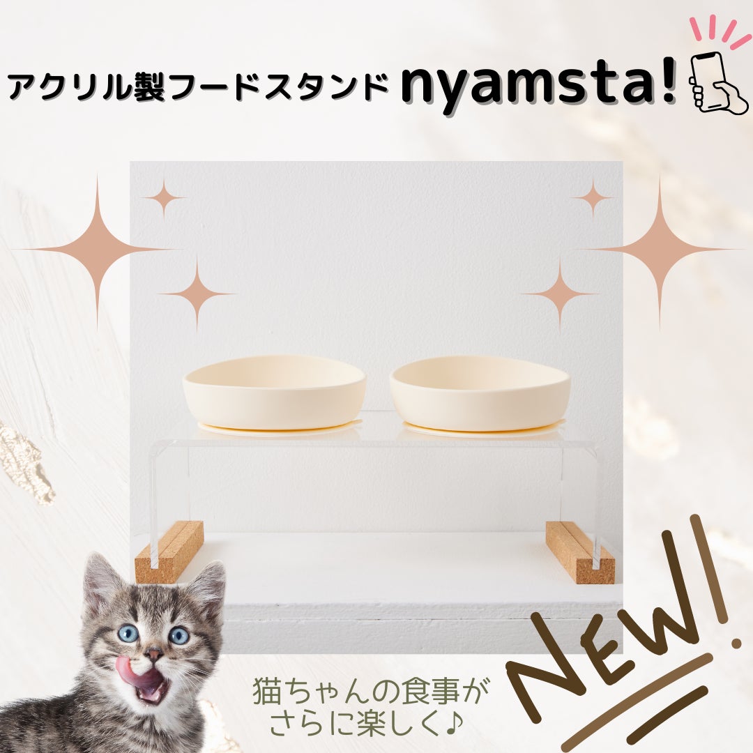 ☆insta映え間違いナシの新商品☆猫ちゃんの”yummy!”な顔が撮れちゃう?!アクリル製フードスタンド「nyamsta!:ニャムスタ!」予約販売スタート!