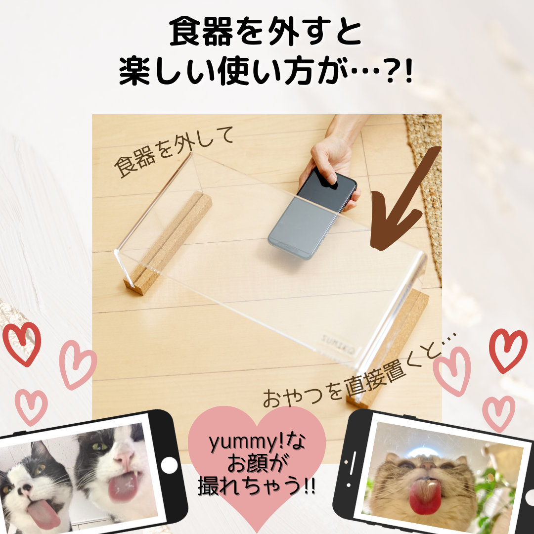 通常の食台としてはもちろん、食台に直接おやつを乗せて、下からスマートフォンやカメラを差し込むと…なんと!愛らしいもぐもぐシーンが撮影できちゃう新発想のフードスタンドなんです♪